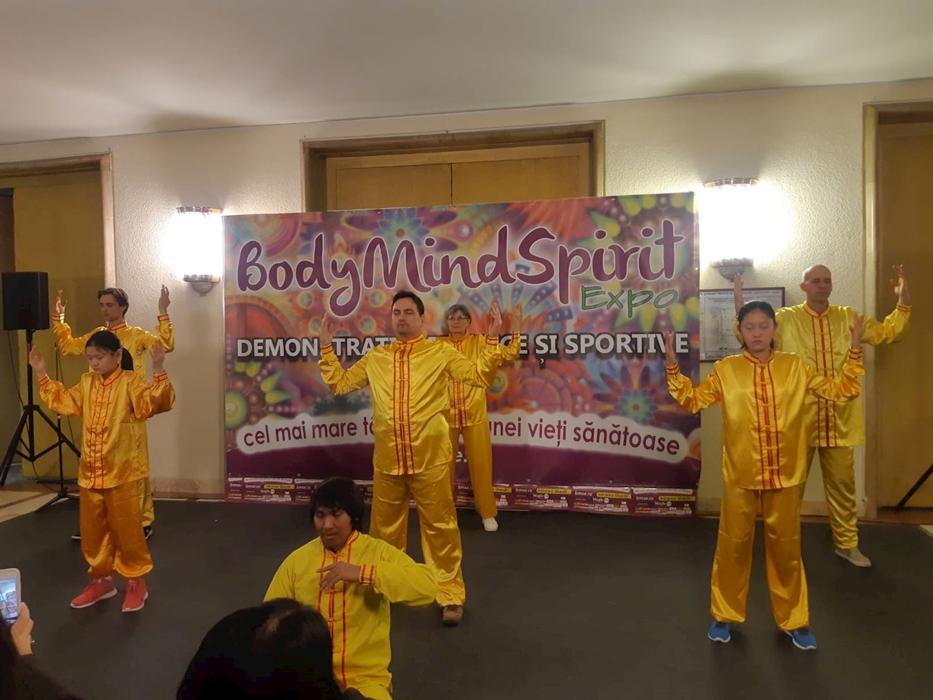 法轮功学员的功法展示吸引不少人驻足观看。很多观众看到后直接在现场开始学炼,其中还有两位中国商人也表示想学,学员告诉对方网址和炼功地点,之后他们说要回去上网看。
