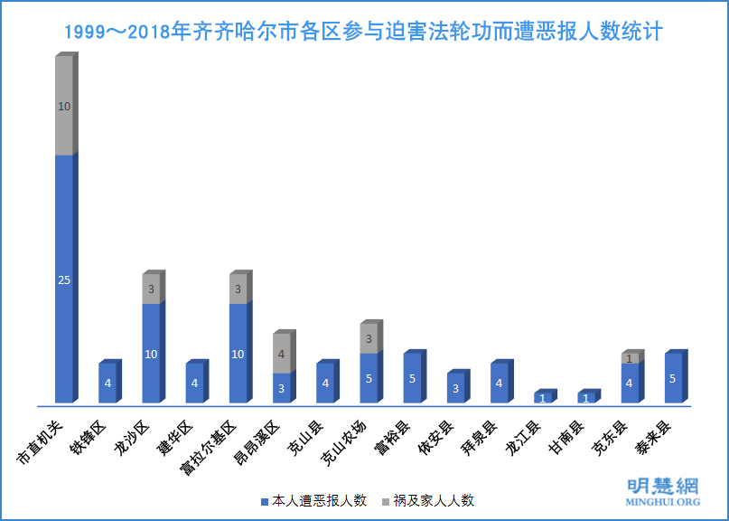 ![]() 图1:1999~2018年齐齐哈尔市各区参与迫害法轮功而遭恶报人数统计 |