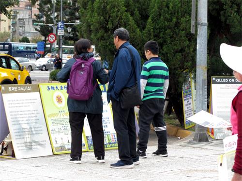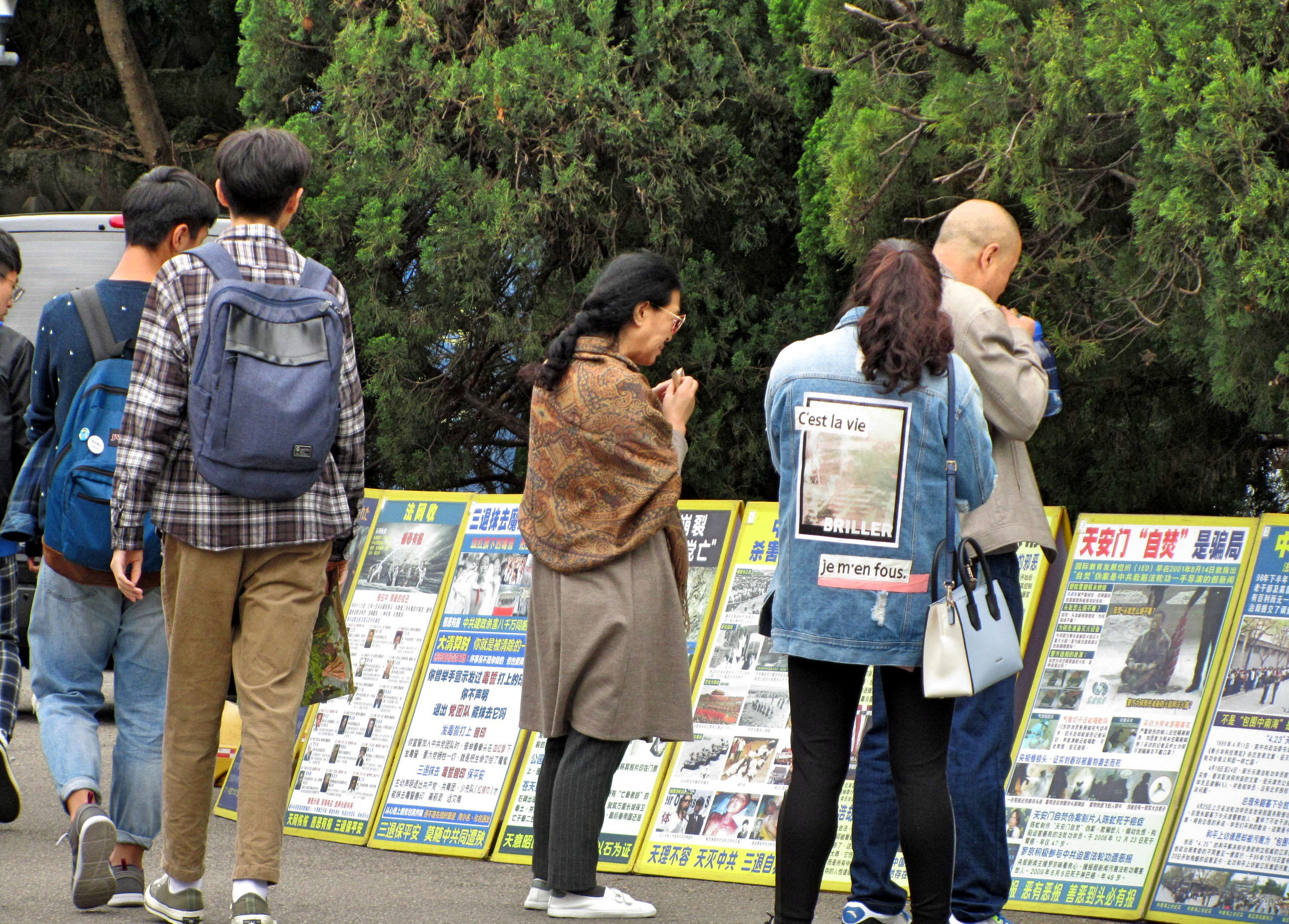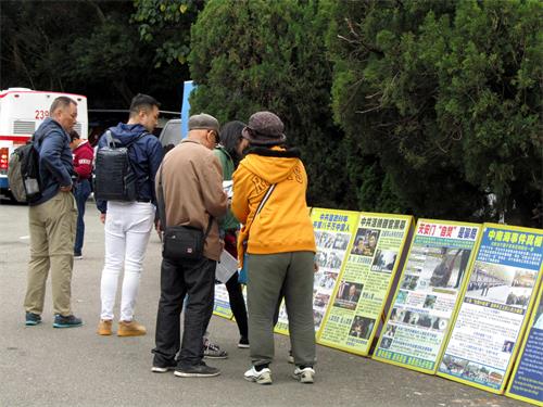熙来攘往的游客,有的驻足展板前观看真相内容,有的手指着特别关注的真相与同伴分享或讨论,有的从学员手中接过真相报导认真阅读,有的聆听学员讲真相,许多明白真相的中国游客,请学员帮他们声明三:退.(退出中共党、团、队,简称三:退.),也有不少人,早已上网三:退.,或在家乡接获法轮功学员的电话,明白真相后已经三:退.,匆匆一走一过之间,拿起手机拍摄展板上的真相,表示要带回去与亲朋好友分享。