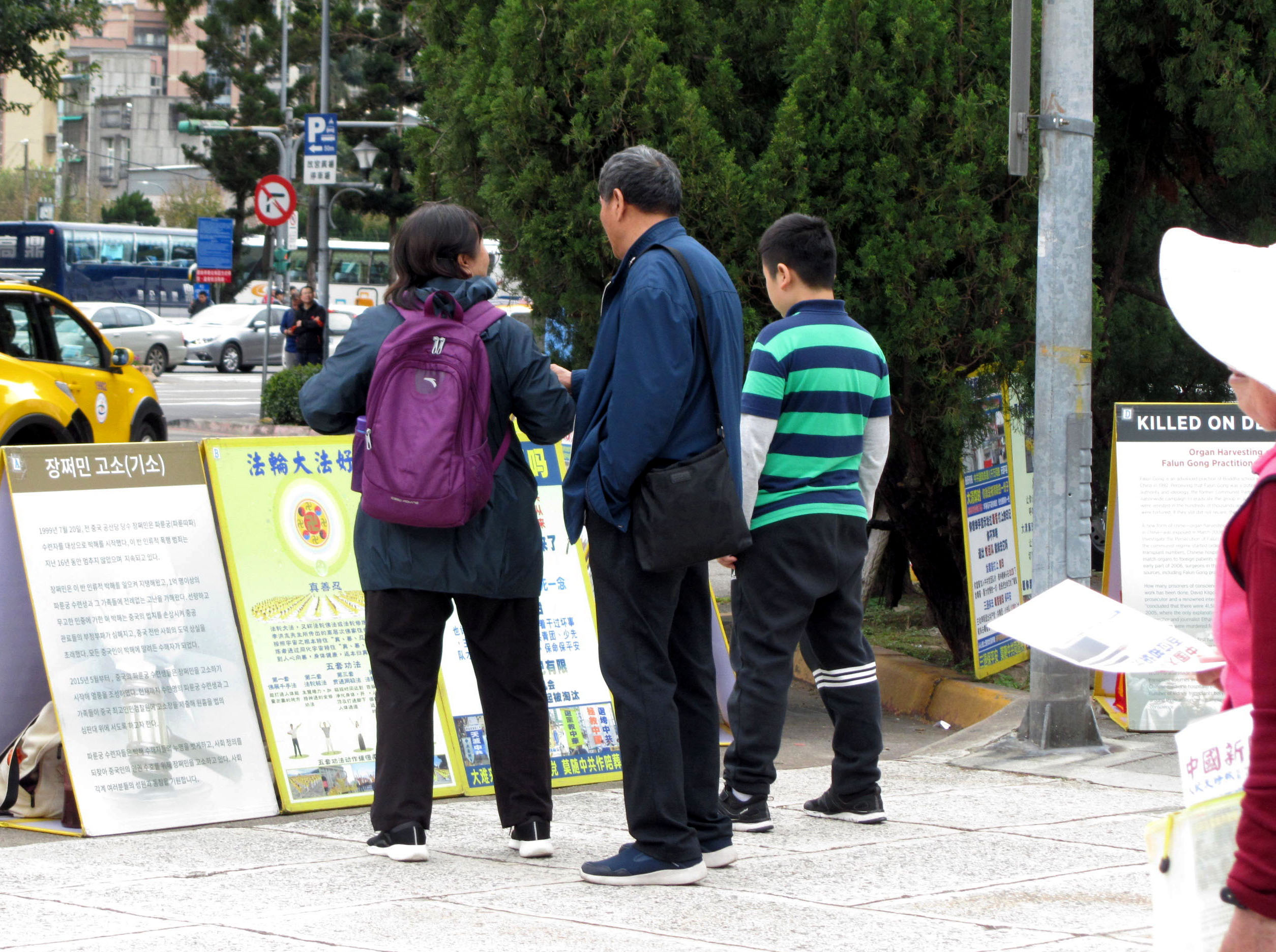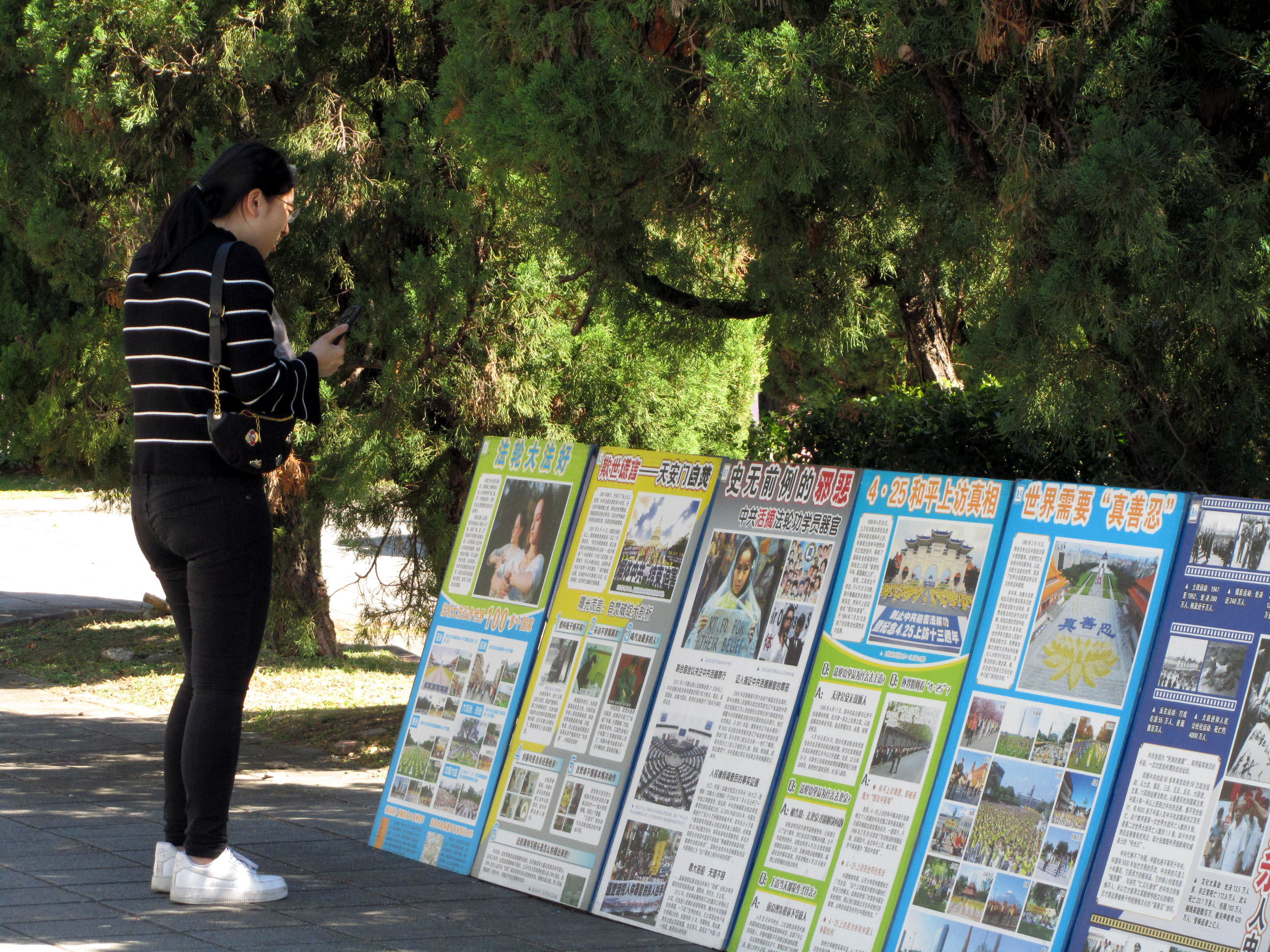 故宫院区前面,宽广空地的左右两侧,分别植栽翠绿的树木围篱,区隔大小车辆接送旅客时临停,以及旅客步行或停留区域的界线。挨着青翠的树篱笆,排列着法轮功的真相展板,印证法轮大法弘传世界、在各地受到欢迎和褒扬的盛况;揭露中共残酷迫害、活摘器官等恶行;以及全球声援中国民众控告罪魁祸首并要求法办迫害元凶的真相。在展现法轮大法的美好的同时,也揭露中共无理迫害的邪恶本质,天灭中共、恶人遭报的必然。