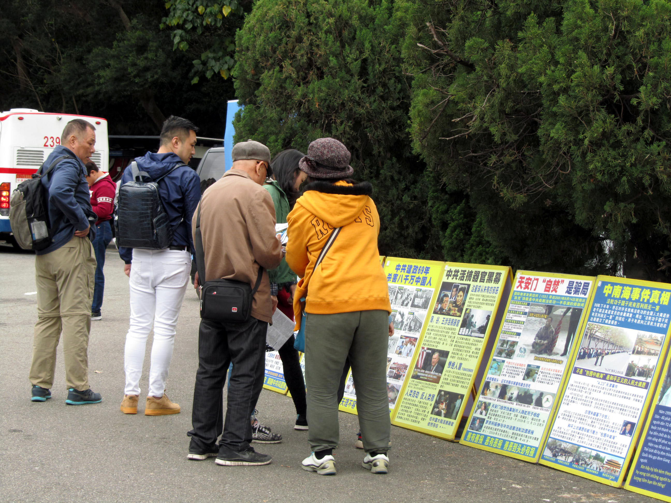 多年来,不管是刮风下雨或严寒酷暑,法轮功学员全年无休地在此告诉世人发生在中国大陆的真相,盈盈可掬地在人群中穿梭,为中外游客、尤其是来自中国大陆的观光客,递上打开了解真相宝盒的钥匙。有的发送真相资料,有的向可贵的中国人讲真相劝善,协助明白真相的中国人声明三:退.。