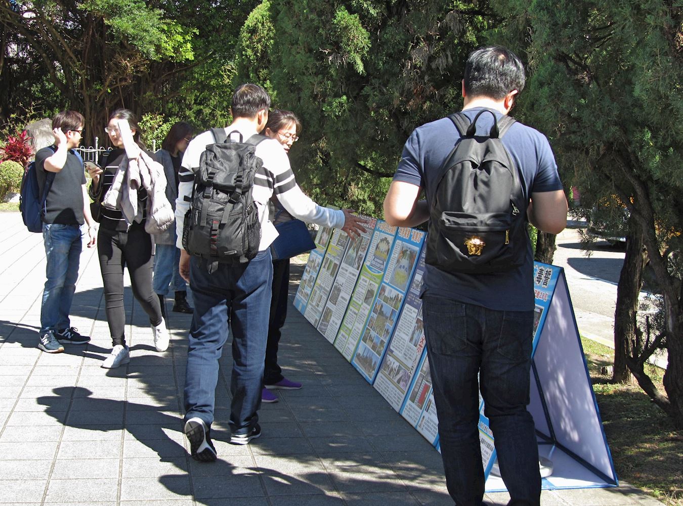 一位二十多岁的年轻人细细观看展板上的真相,他对细泽表示,听过法轮功,但一直搞不懂是怎么回事。于是细泽从法轮功是修炼“真、善、忍”的佛家上乘修炼大法,谈到中共捏造天安门自焚伪案等栽赃污蔑的谎言,再讲到天地神人共愤的中共活摘法轮功学员器官等罪行。年轻人专心聆听并仔细收好翻墙软件说:“阿姨,我明白了,回去后,我要把这些消息传出去。”