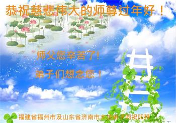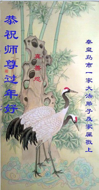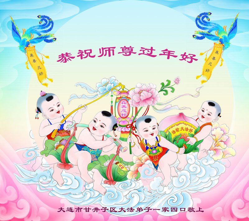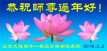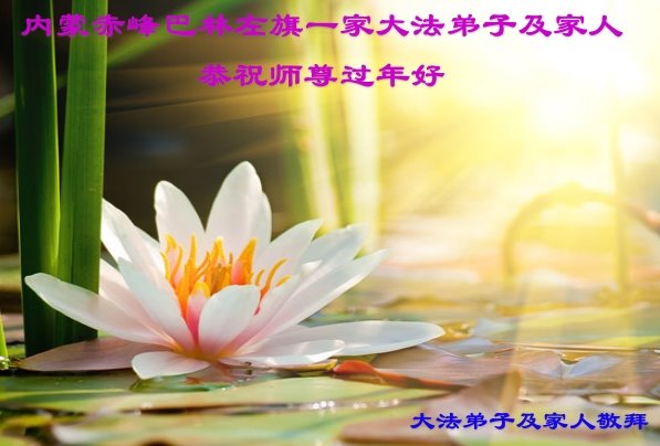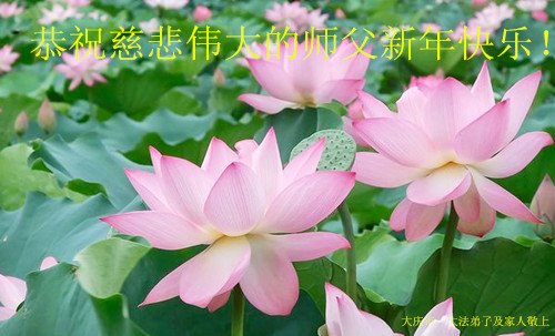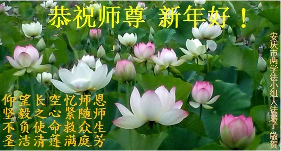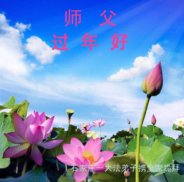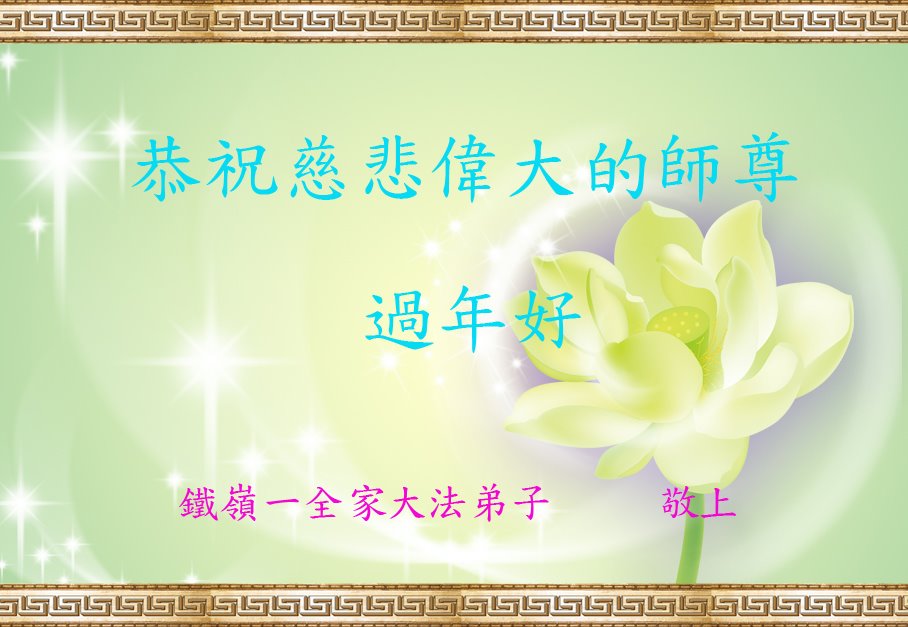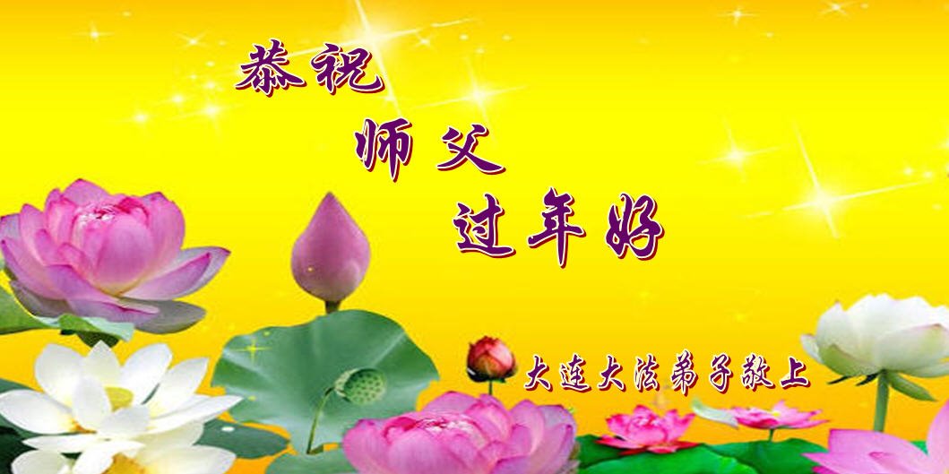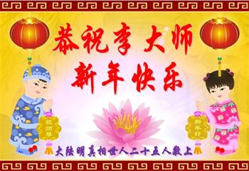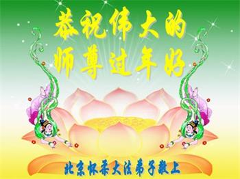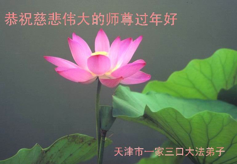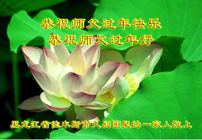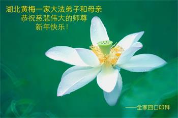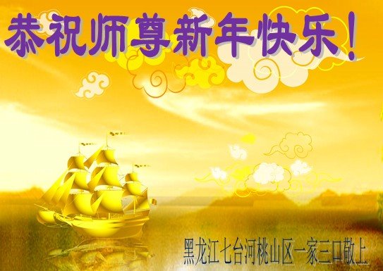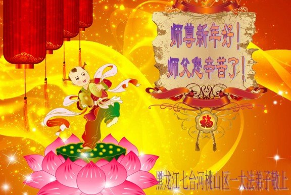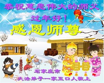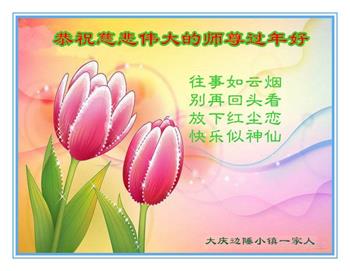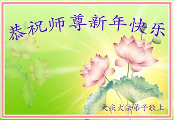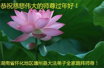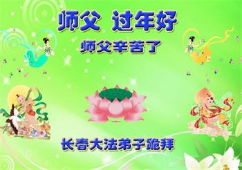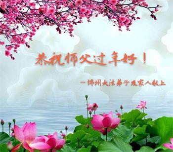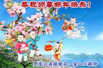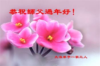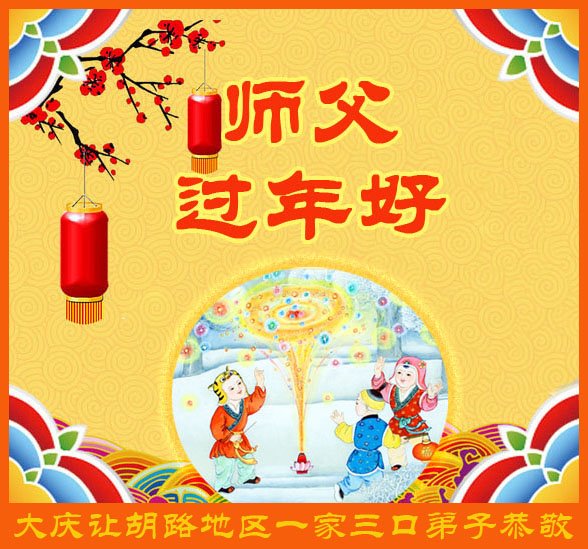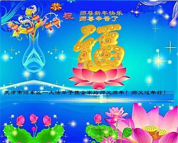 我们是大陆大法弟子的亲人,在您的弟子的耐心帮助之下,我们早已明白了法轮大法真相,早已做了三:退.,远离中共邪*党-;我们常常在心中虔诚敬念“法轮大法好,真善忍好”,现在我们身体健康,家庭和睦。在这新春伊始,万象更新的喜庆日子里,我们恭祝您新年快乐!李大师辛苦了!盼望李大师早日回到中国大陆和您的弟子团圆!