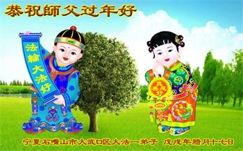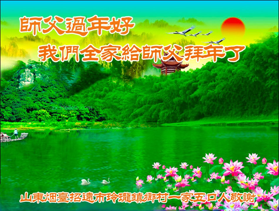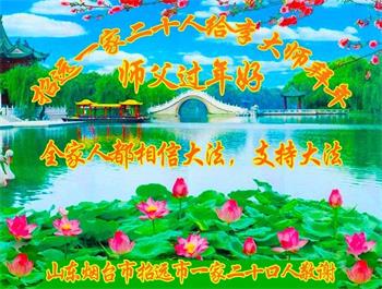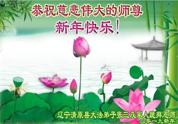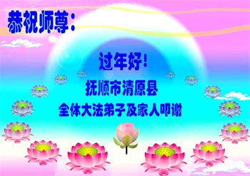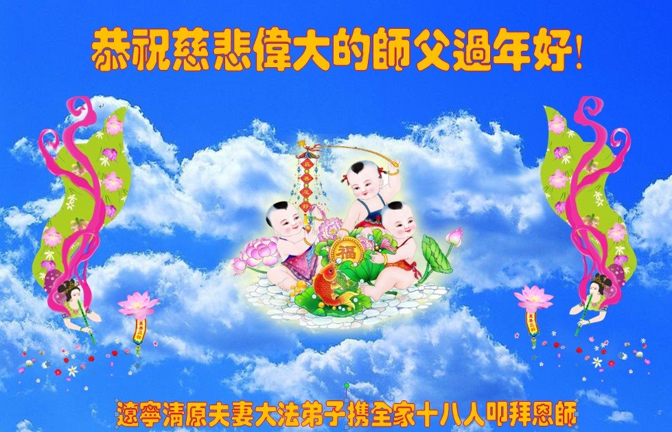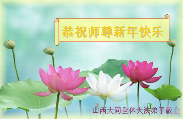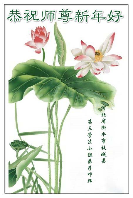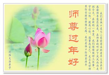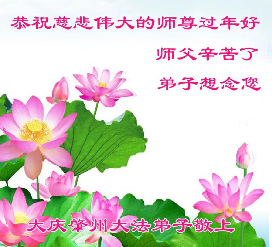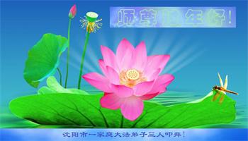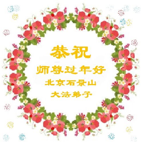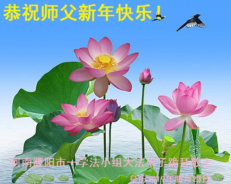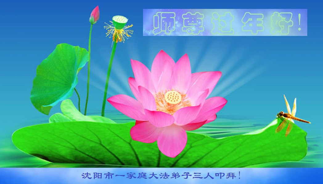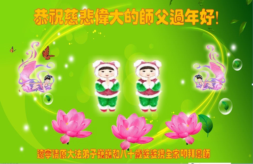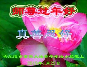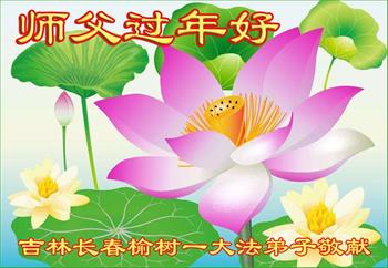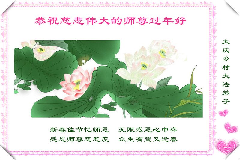 我们是大陆大法弟子的亲人,在您的弟子的耐心帮助之下,我们早已明白了法轮大法真相,早已做了三:退.,远离中共邪*党-;我们常常在心中虔诚敬念“法轮大法好,真善忍好”,现在我们身体健康,家庭和睦。在这新春伊始,万象更新的喜庆日子里,我们恭祝您新年快乐!李大师辛苦了!盼望李大师早日回到中国大陆和您的弟子团圆!