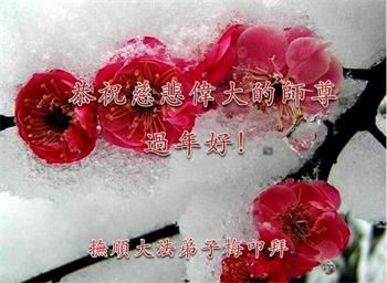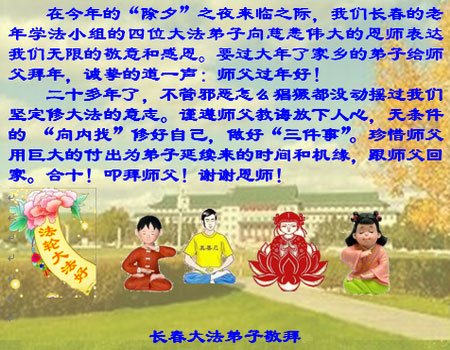 我是明白法轮功真相的,我知道法轮功是教人向善做好人,大法师父教出了一大批道德高尚的人,为别人着想的人。新年就要到了,我祝大法师父新春佳节快乐!