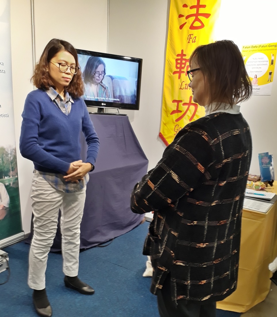 法轮功学员也在展会上设立了展位,向前来参加展会的来宾介绍法轮功,同时揭露中共迫害法轮功的真相。很多参观者对法轮功功法很感兴趣,有的当场学炼,有的则询问哪里还可以学炼,以及在自己城市的炼功点等讯息。也有的老师想邀请学员到他们到学校教学生炼功。