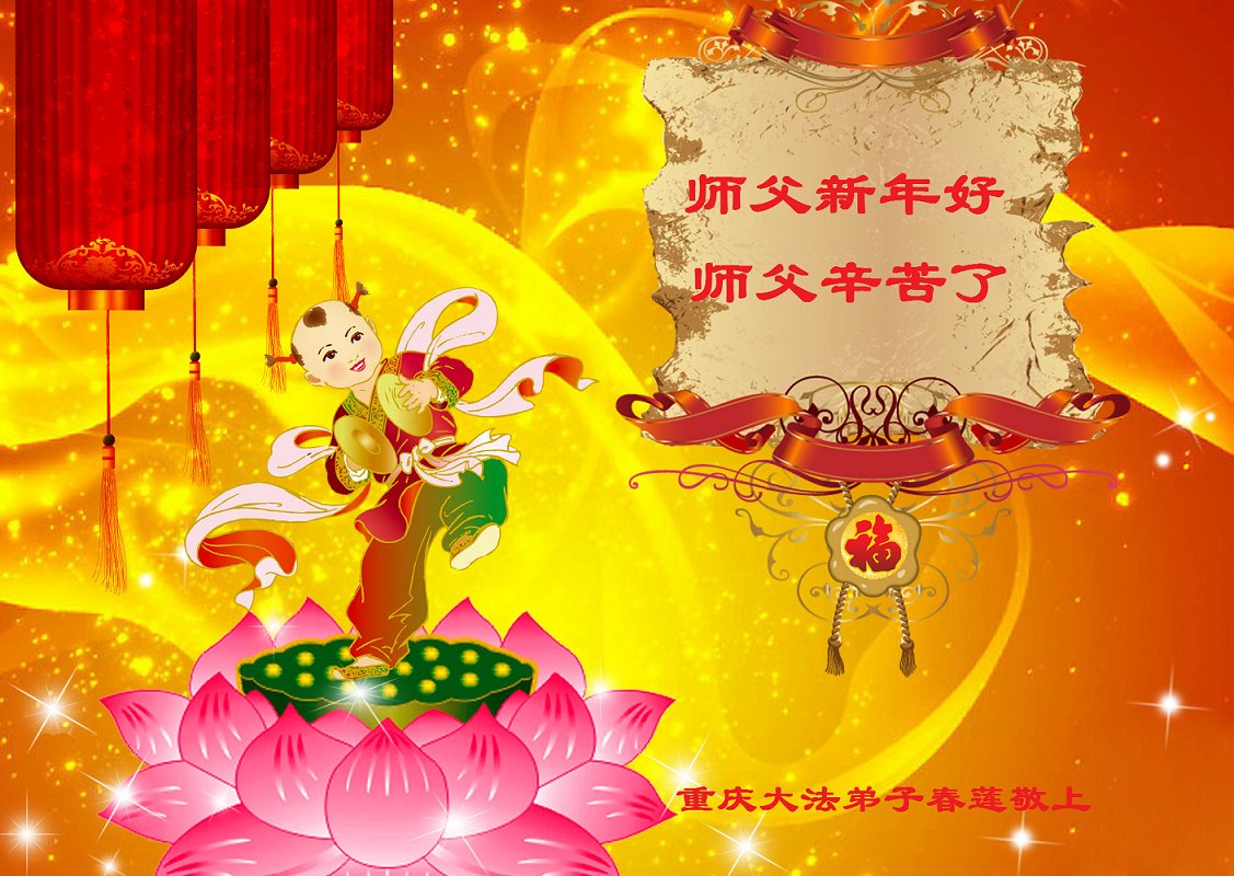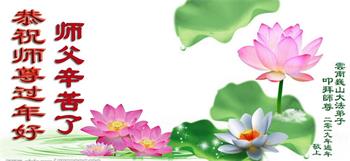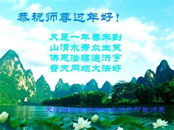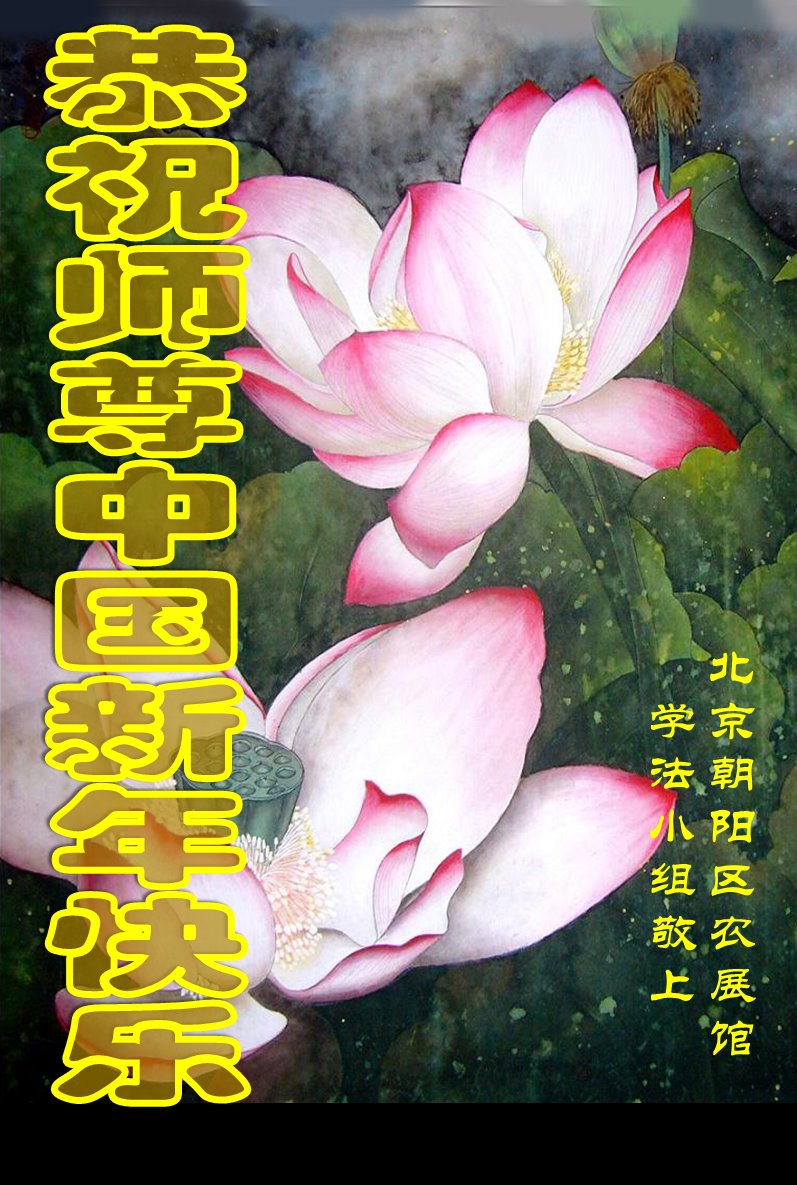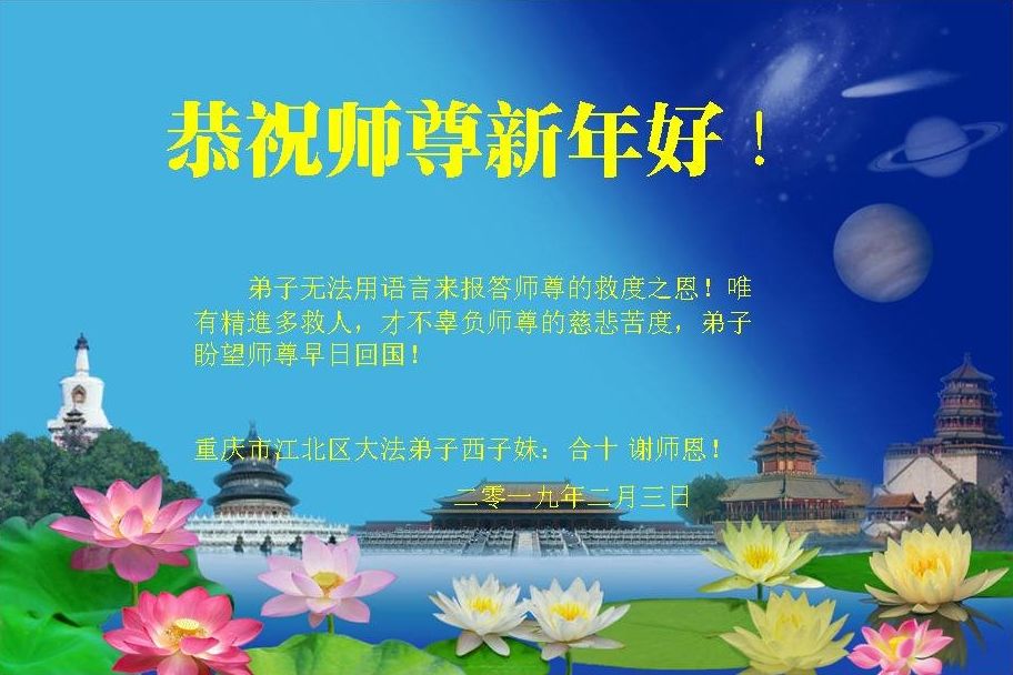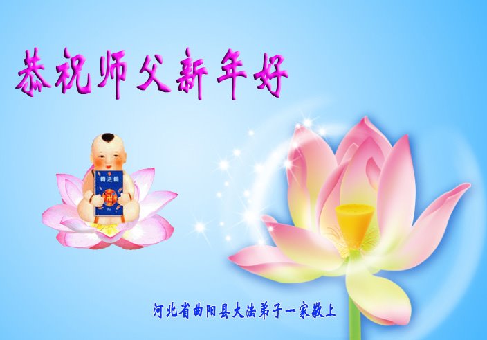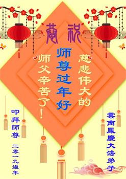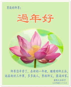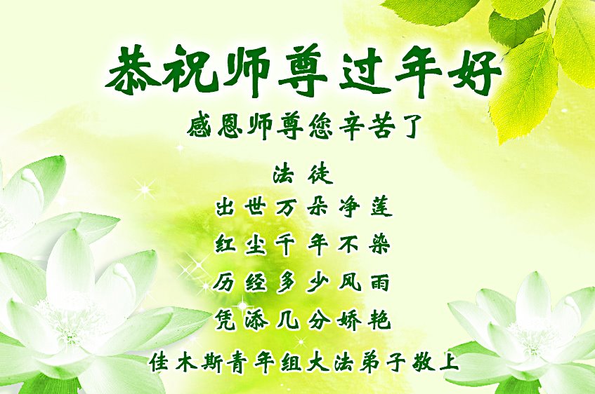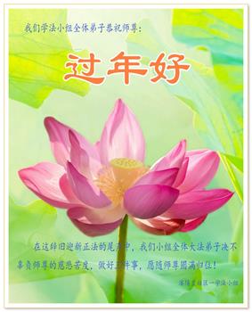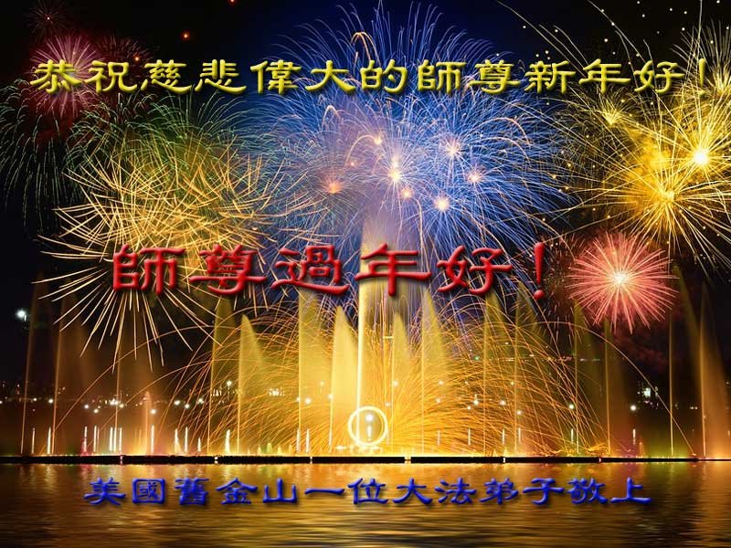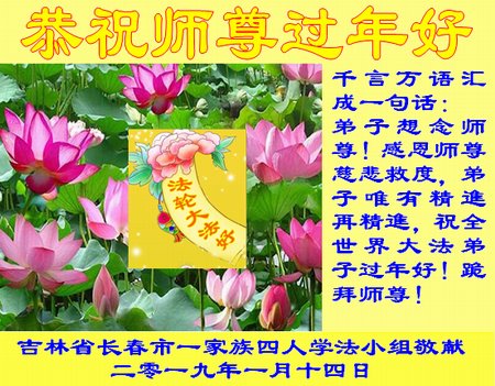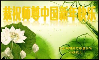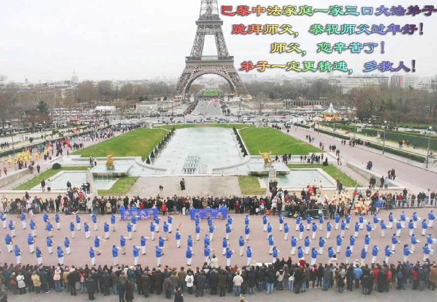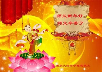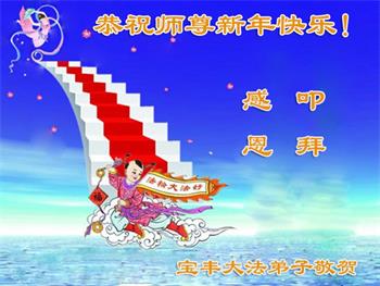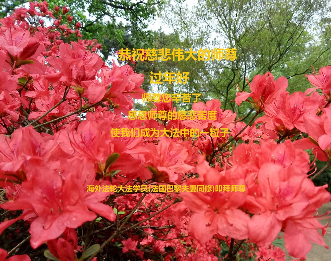 尊敬的师父:您好!在师尊救度苍穹无量众生、法正洪宇的伟大正法中,又一个中国新年来临了。值此辞旧迎新之际,法国大法弟子在无限感恩中向慈悲伟大的师父拜年!恭祝师父新年快乐!