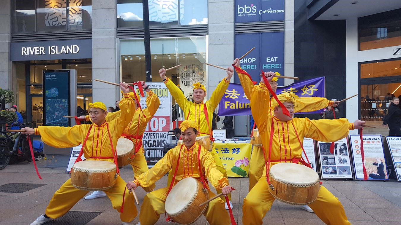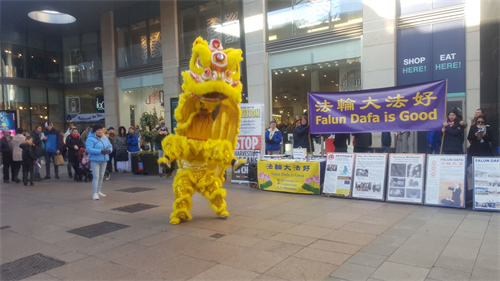 学员们身着中国传统炼功的服装展示法轮功的五套功法,并举行了舞狮、打鼓和莲花舞等表演。每次表演都吸引了众多的爱尔兰民众围观,也有一批接一批的民众来到介绍法轮功的真相展板前了解真相,并在反对活摘法轮功学员器官的征签信上签名。还有一些人留下联系电话希望能参加法轮功的义务教功班。