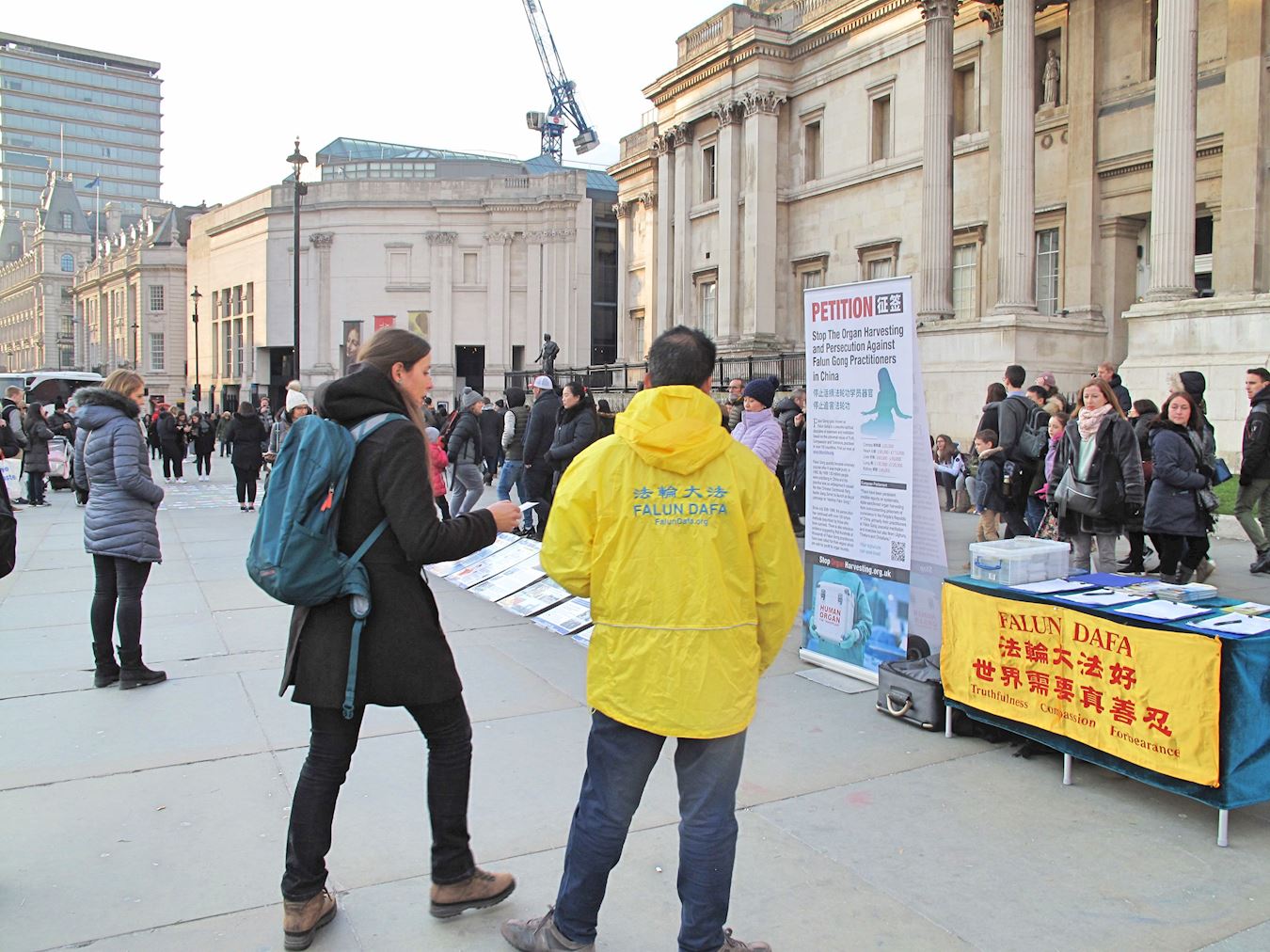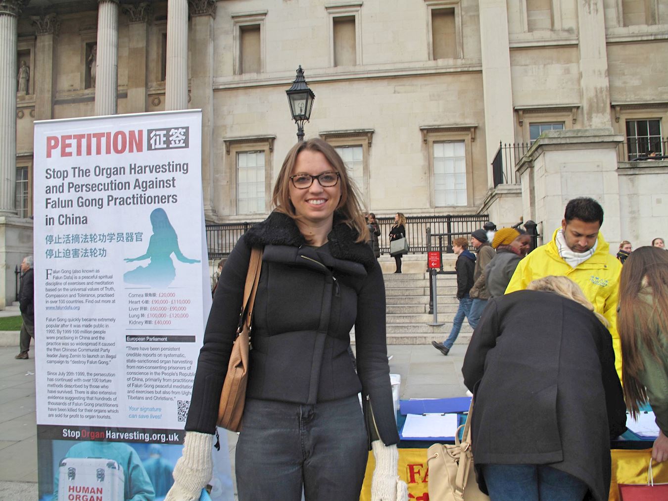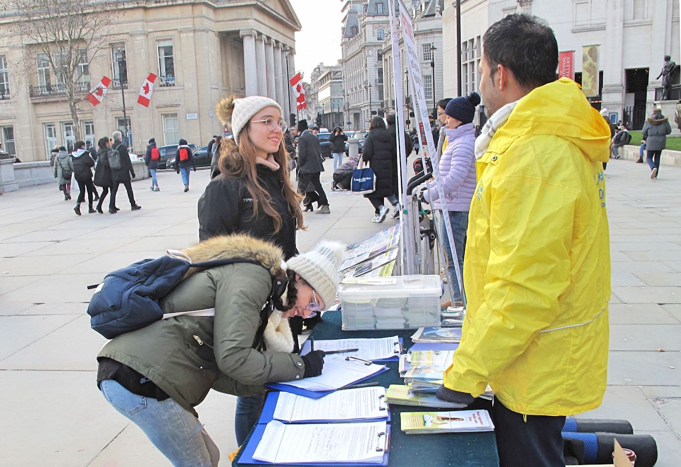 当天,伦敦女士汉娜(Hanna)在伦敦特拉法加广场深入了解法轮功真相后立即签名反迫害,她谴责中共残酷迫害法轮功的行径是与“善”和“和平”的对立,而中共活摘法轮功学员器官的罪行令人震惊。她表示回去后要马上找离自己家最近的法轮功义务教功点去学功。