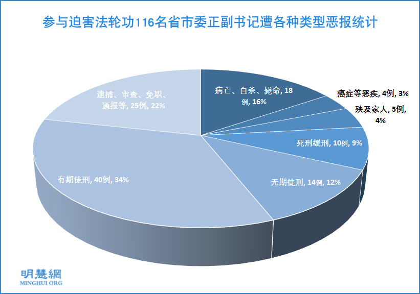 ![]() 图:参与迫害法轮功116名省市委正副书记遭各种类型恶报统计 |