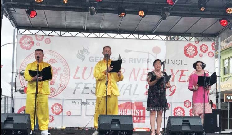 接着由四位法轮功学员合唱法轮功自创歌曲《为你而来》和《辞旧迎新年》时,特别是当西人学员用中文唱到“法轮大法好”和呼唤众生明白真相的歌词时,当场许多华人为学员们鼓掌及喝彩。很多观众纷纷举起手机拍摄,希望抓住那美好的瞬间,带回去和亲朋好友分享。