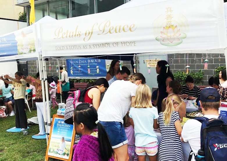 当天,法轮功学员在活动展位上演示功法、免费教功和教手工折纸莲花,展位被乐呵呵的民众挤满了。各族裔民众表现出对法轮功的浓厚兴趣和高度赞赏。
