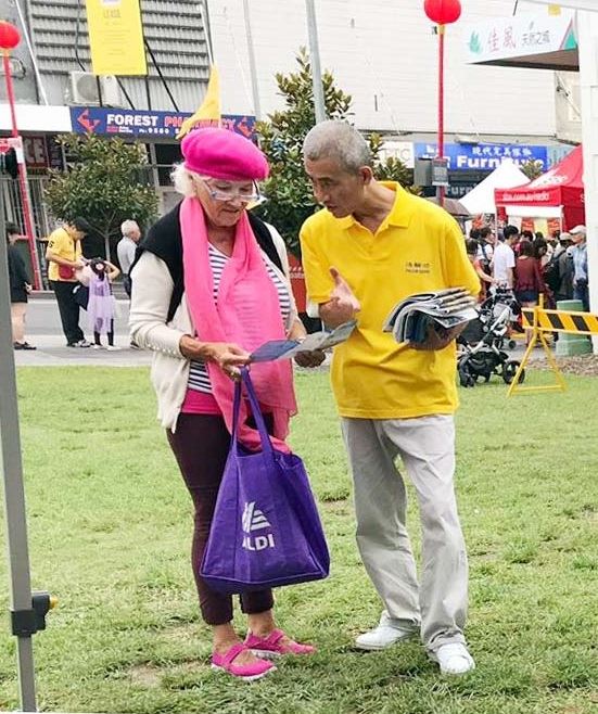 另一位中年华人女士走到法轮功展位前张望着,法轮功学员跟她打招呼并递过真相资料,可那女士一摆头说:“不要。”但她紧接着又说:“你们有《转法轮》书吗?”法轮功学员这才明白过来,这是已经明白真相的华人来找《转法轮》书,要学法轮大法了。