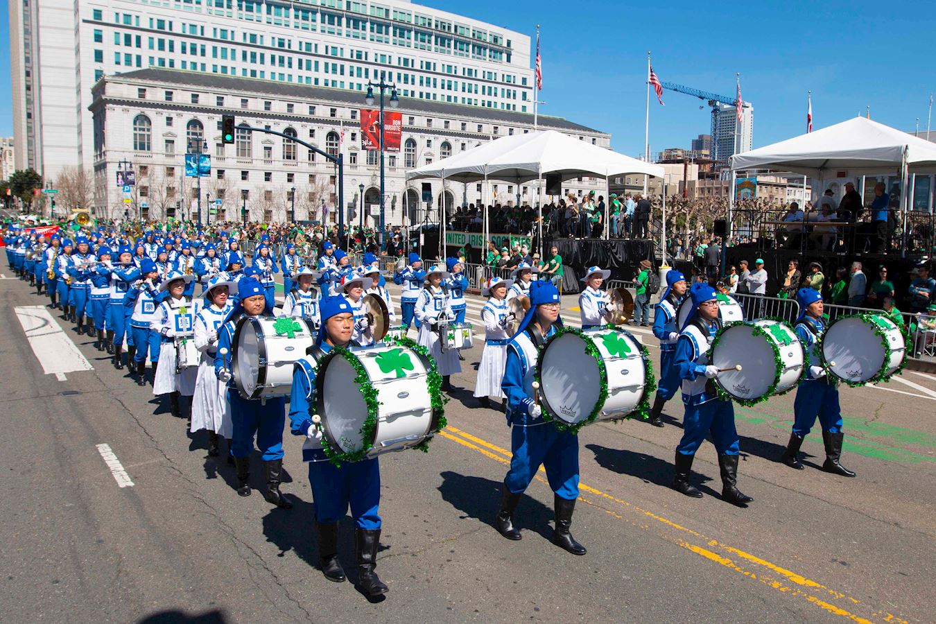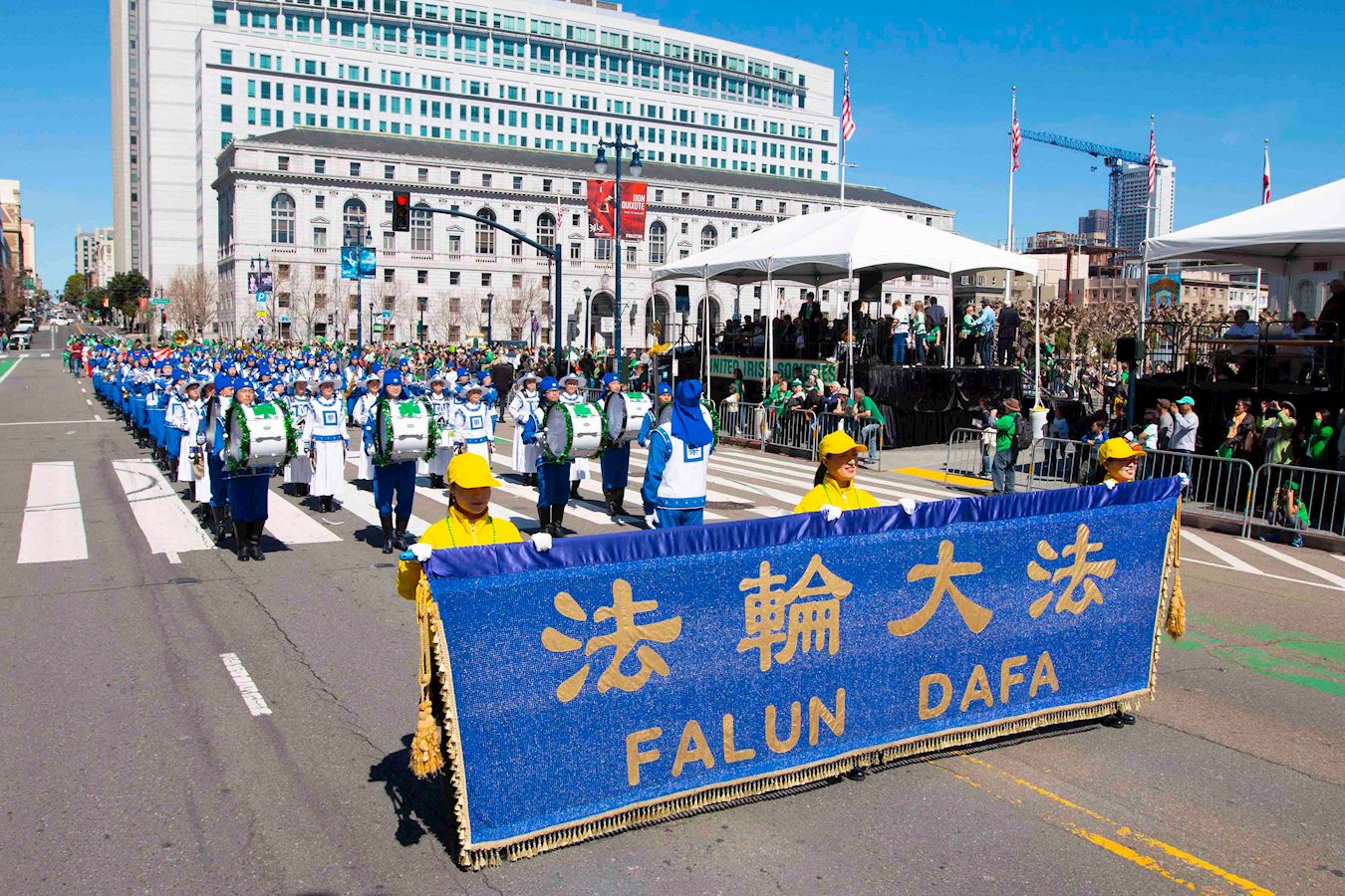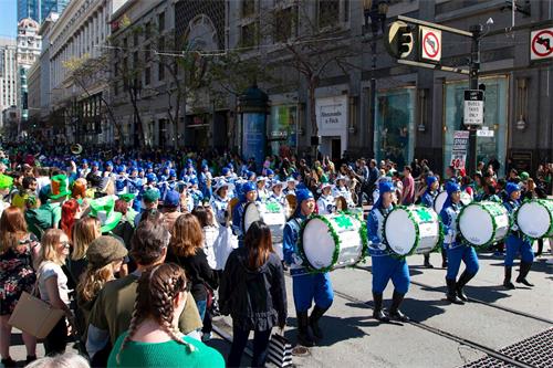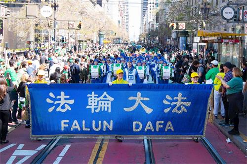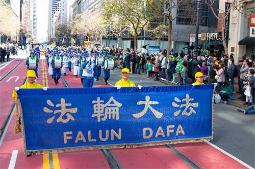 当天,旧金山阳光明媚,游行的主要街道市场街的两旁人山人海。有上百个团体数千人参加的游行,法轮功学员的队伍是最壮观、整齐的队伍之一。他们为观众演奏了《法轮大法好》和《星条旗永不落》等乐曲。一些法轮功学员在游行队伍两侧的人行道上发传单,介绍法轮大法的美好。