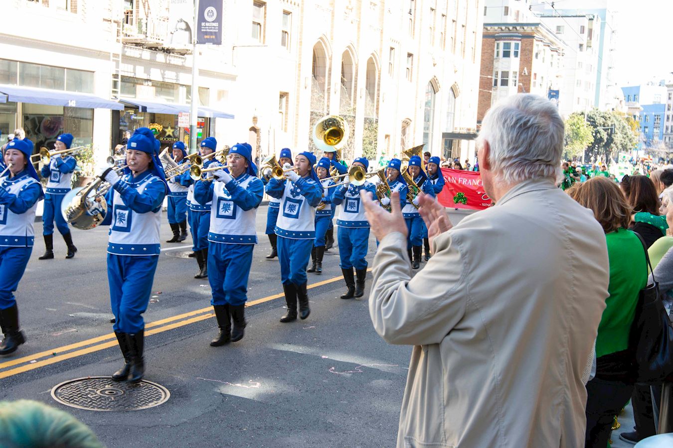 约翰(John)非常喜欢法轮功学员的队伍,在法轮功学员的队伍经过时高兴地鼓掌,他说:“他们的演奏很棒,我们需要更多这样的队伍,他们看起来精神抖擞,很高兴在这里看到他们。”