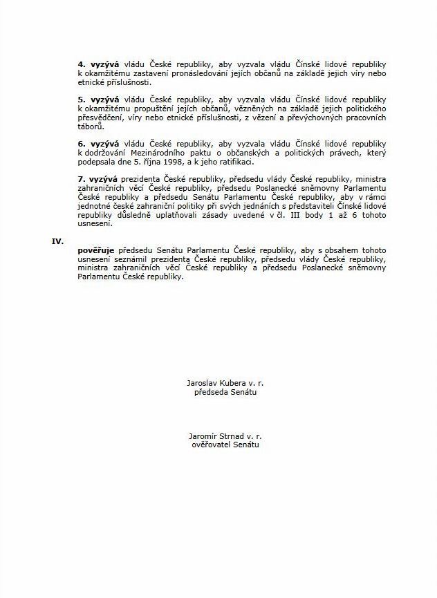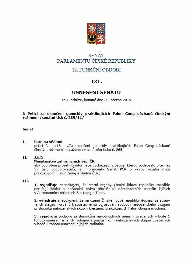 | 图1~2:二零一九年三月二十日,捷克参议院通过了131号决议。呼吁捷克政府和总统要求中共停止迫害,释放政治良心犯,遵守和批准国际人权公约。 | |