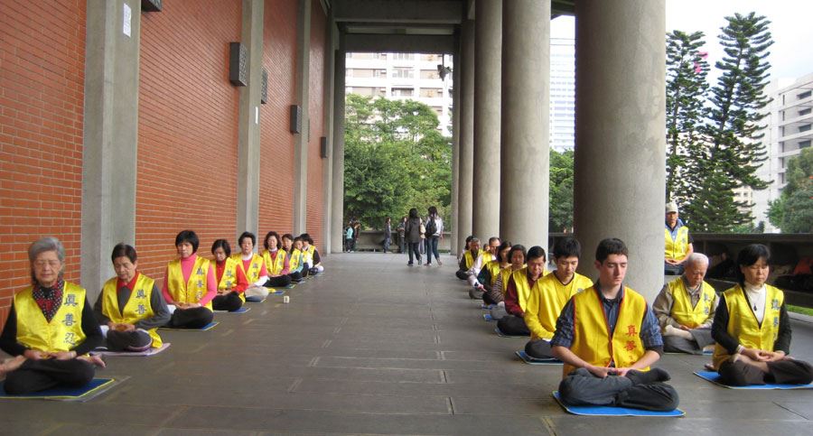 二零零八年七月,台湾正式开放中国人民来台观光旅游,法轮功学员们发现中国大陆游客很多,纪念馆正门右侧斜对面的大停车场,络绎不绝的大型游览车,一辆辆接送一批批的大陆观光客来来往往。学员们觉得应该把握时机讲清真相,让中华儿女有选择光明未来的机会,不让中国游客白来一遭,于是协力自掏腰包制作真相展板及资料,在出入停车场必经处的行砖道边,摆上真相展板,向川流不息的中国游客传递真相与祝福。