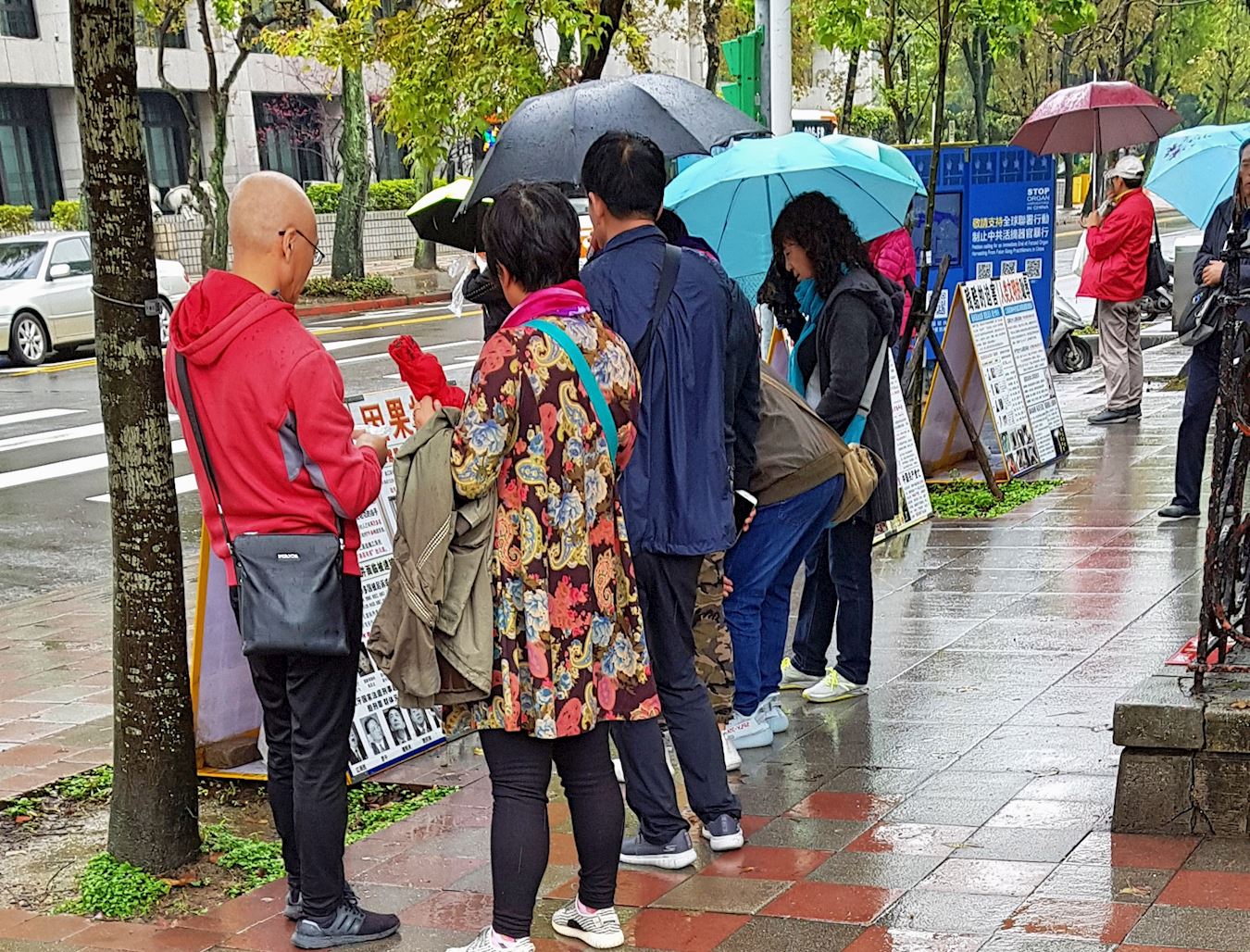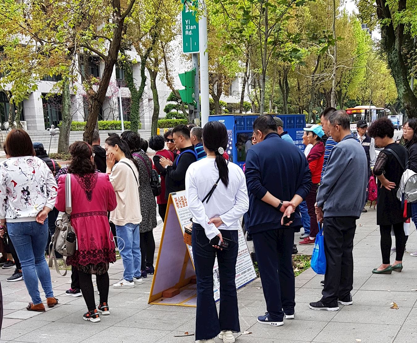 逸仙路和忠孝东路人行道边,矗立的展板记述着法轮功真相。法轮大法弘传世界各地的炼功照片,以及小型电视播放香港、美加等地法轮功学员的游行影片,壮观殊胜引人赞叹不已。而记载着中共迫害大陆法轮功学员致伤、致残、致死,甚至活摘器官的血淋淋的照片触目惊心,许多人不敢相信自己的眼睛。小型电视播放《伪火》影片,揭穿“天安门自焚”伪案的造假欺骗伎俩。