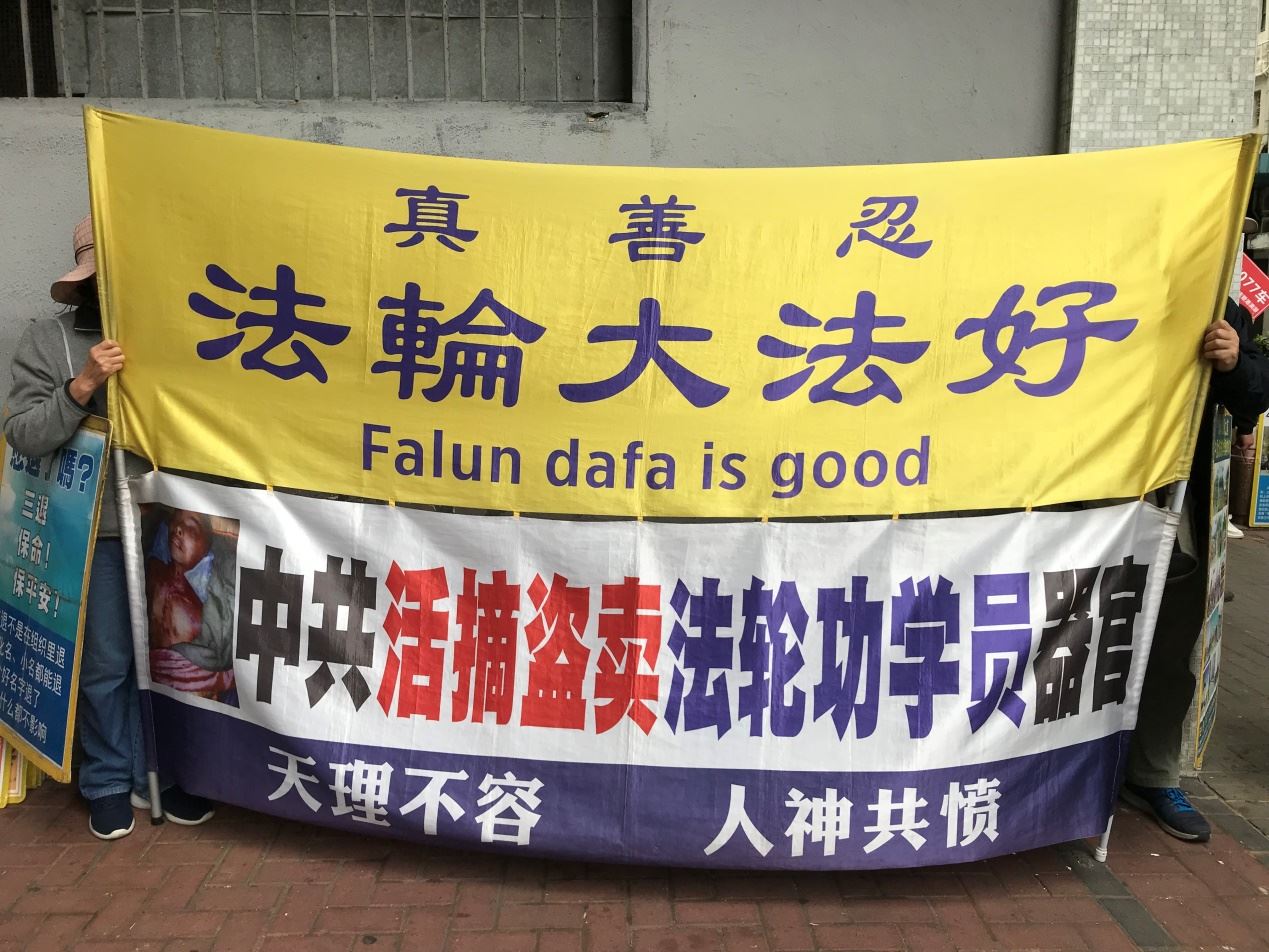 ![]() 香港法轮功学员手持横幅、展板传播真相 |