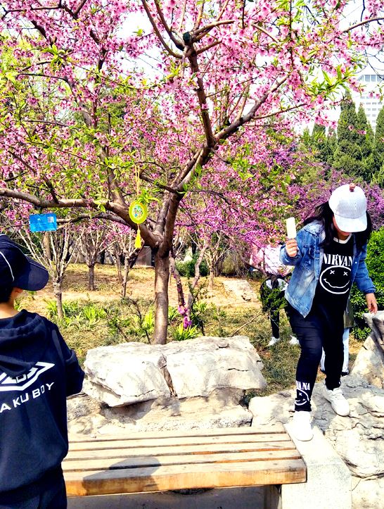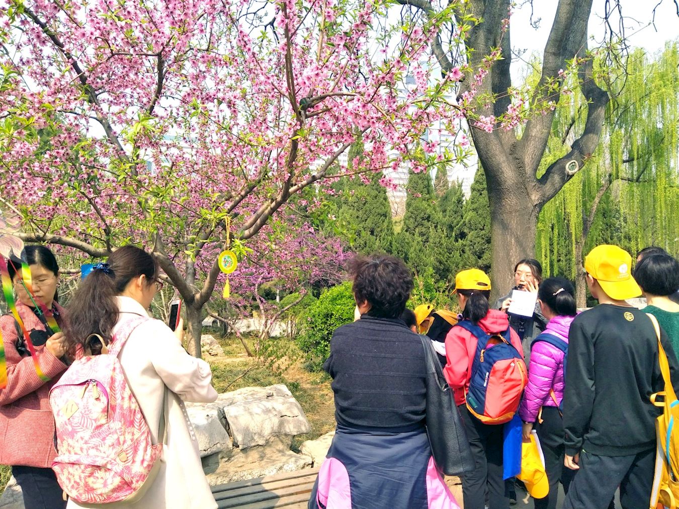 | 从树下过往的人川流不息,照相、看花、看这个小光盘挂件。还有导游走到这棵树下,带着一群学生站在那里讲解……也有人坐在树下吃东西或休息。很多人围着这棵树。