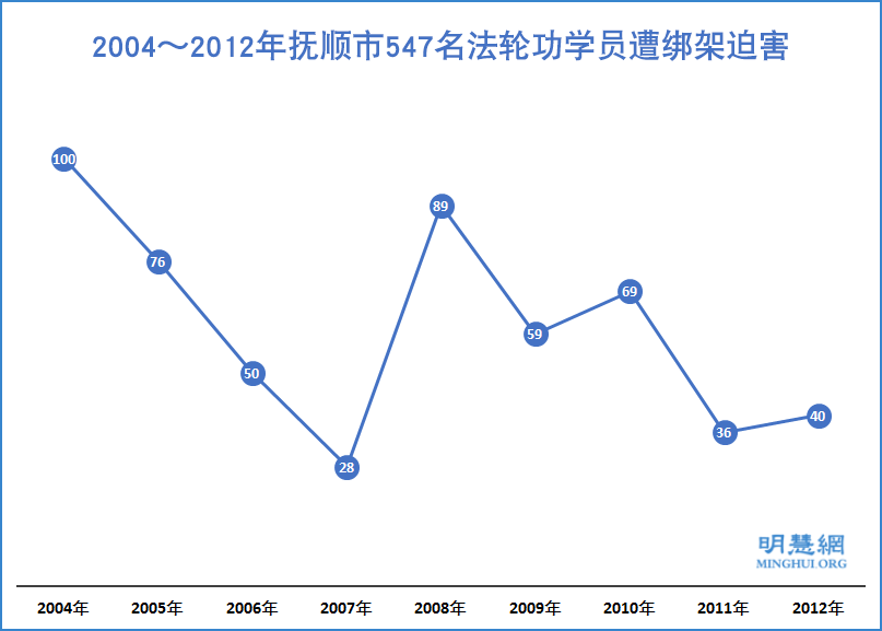![]() 图1:2004~2012年抚顺市547名法轮功学员遭绑架迫害 |