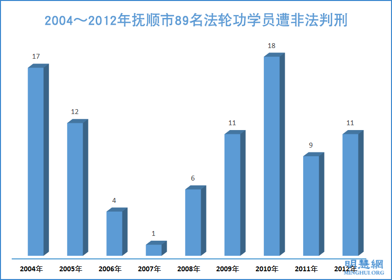 二、判刑迫害:据明慧网不完全统计,2004――2012年间,抚顺市法轮功学员遭非法判刑89人。人数按年度分布如下: