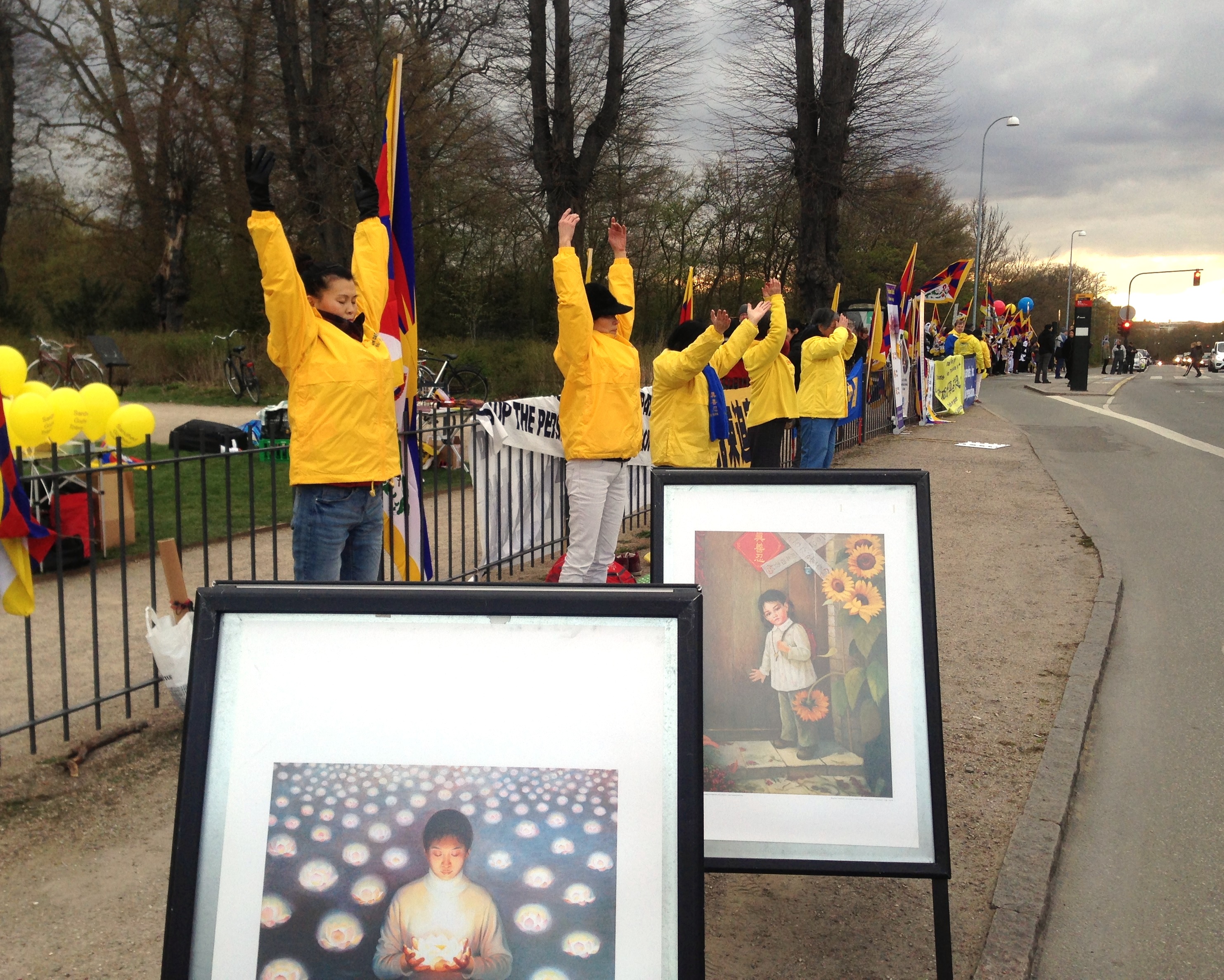 一位年轻的丹麦人骑车载着儿子来到现场,他告诉学员:“看到电视新闻正在现场报道这里的情况,我们便赶来声援你们,反对中共迫害善良民众。我们看清中共熊猫外交背后的用意。”