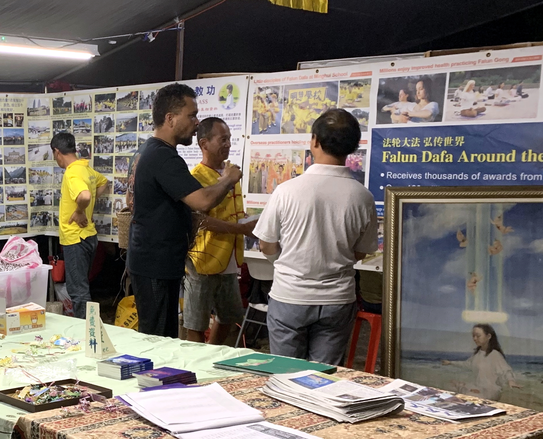 塞班岛法轮功学员在展棚内展出的法轮大法弘传世界、反迫害、活摘黒幕、正义支持、世界褒奖、三:退.保平安的图片及中英文解释等内容,吸引着过往的民众进入观看了解。通过学员们的讲解与答疑,很多有缘人对法轮功真相有了更全面的了解。