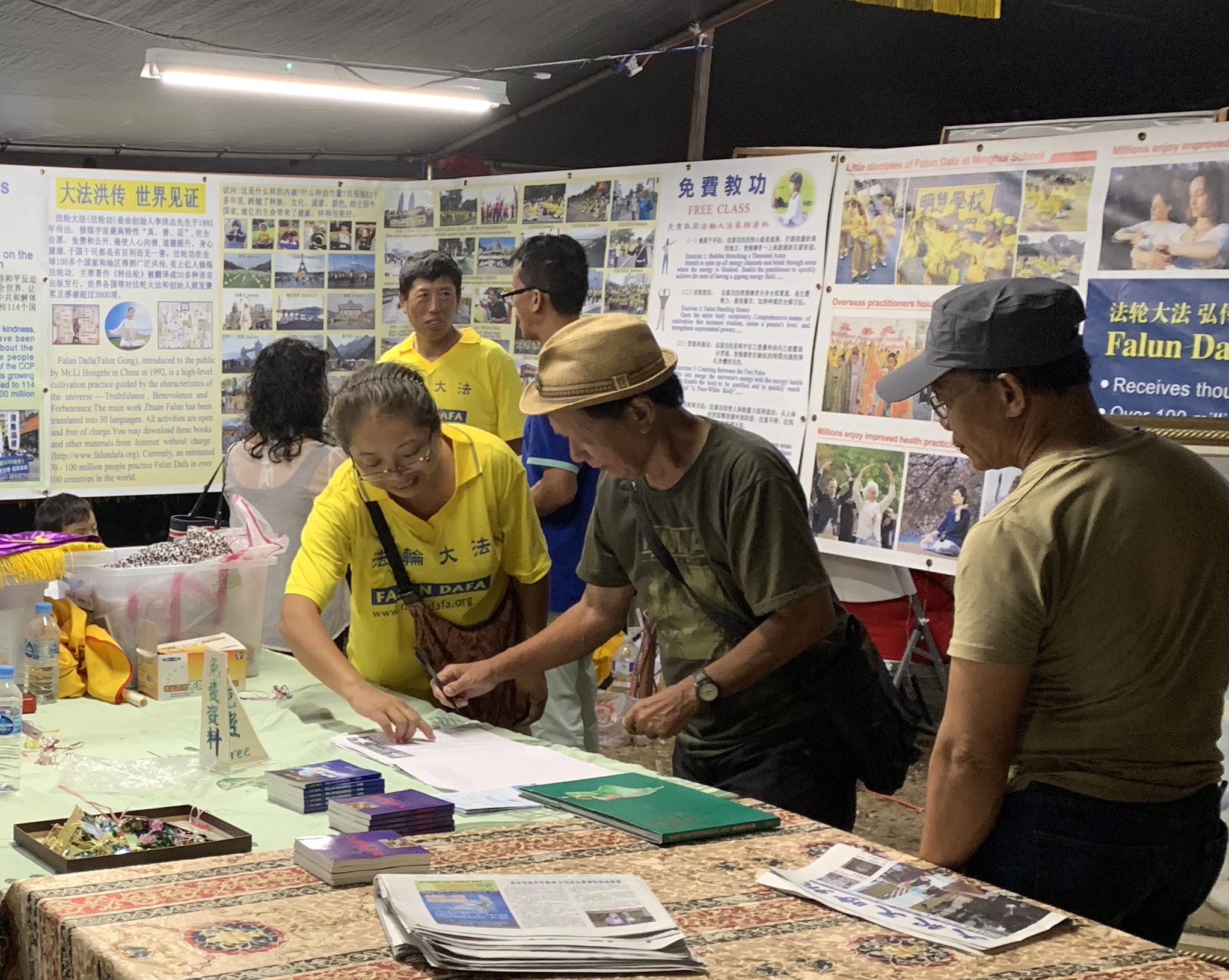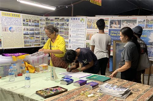 展棚边的义务教功和功法演练场地也吸引了许多想了解想炼功的人,有人让学员教炼动作,有的人模仿着学员的动作跟着炼,很多人了解功法功理,也有的人要了炼功地址和联系方式。四天的火树节,越来越多的人了解了法轮大法的美好,并支持声援法轮功学员反迫害。还有许多明白了真相的中国人做了三:退.,给自己选择了美好的未来。