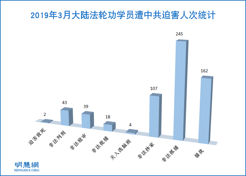 ![]() 图1:2019年3月大陆法轮功学员遭中共迫害人次统计 |