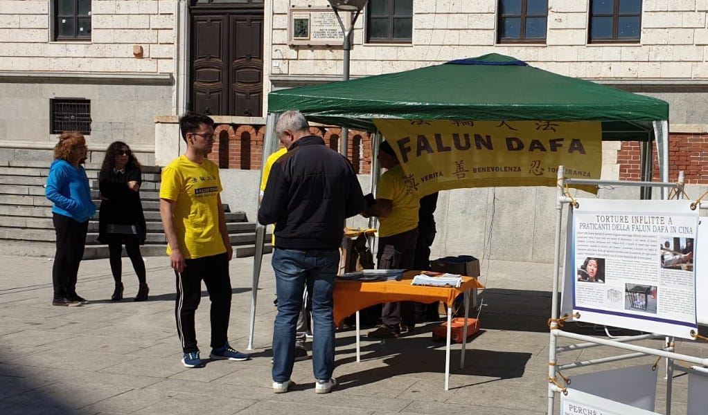 一对来自布雷西亚 (Brescia)的夫妇,前不久刚从中国旅游回来,他们很高兴能在撒丁岛看到法轮功学员的展台,在认真地听取有关迫害的咨询后他们小心地保留了传单。