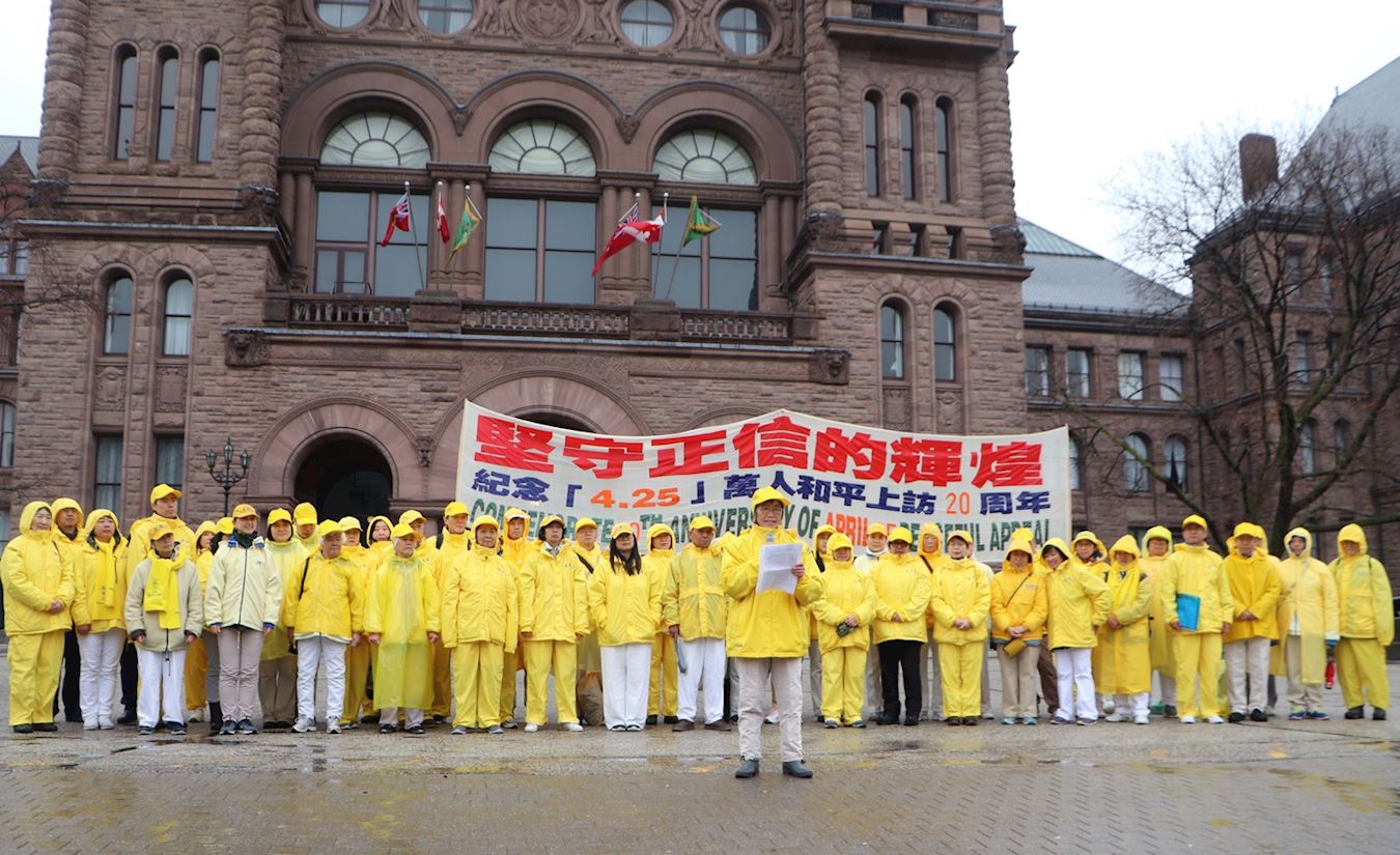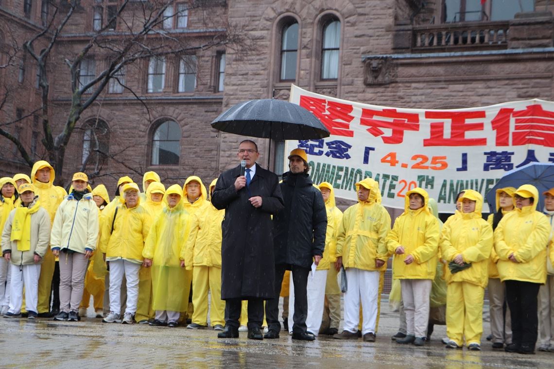 加拿大国会议员肯特(Peter Kent)是国会法轮功之友组织主席, 他说:“二十年前的四月二十五日,过万名法轮功学员和平上访,要求可以自由地修炼法轮大法。几个月后,中共开始迫害法轮功,手段包括酷刑,非法监禁,等等,这迫害已持续了二十年。”