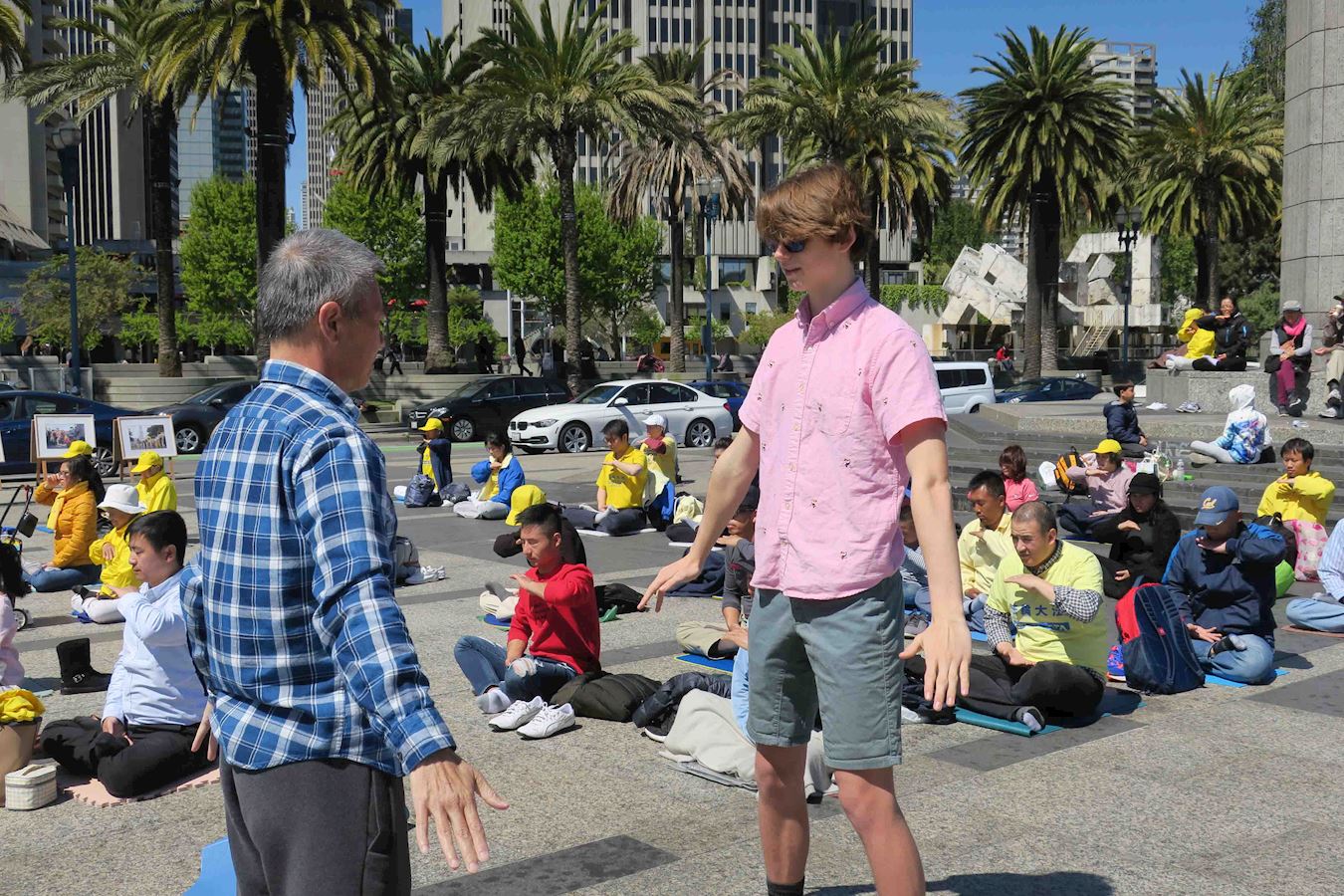 旧金山居民萨拉(Sara)和弟弟唐尼(Tony)中午经过活动现场,被法轮功祥和的炼功音乐吸引,情不自禁地走入炼功队伍,和学员坐一起学着炼第五功法。当学员经过时迫不及待的要求学员,可不可以教我炼功?当学了第五套功法的动作后,萨拉表示,“感觉太棒了,身心舒畅,好象整个身体溶为一体,非常特别的感觉。””弟弟唐尼表示,“感到非常的祥和和放松,好象每个动作都有不同的意义,非常地有趣,很难描述那种奇特的感觉,必须亲身体验才能感受到那种奇特的感觉,我会上网下载炼功录像带,也会了解更多的讯息。”