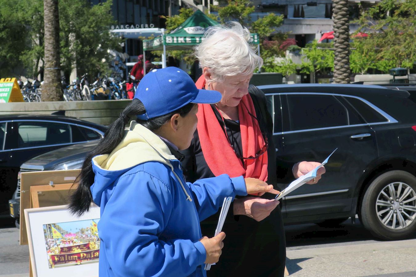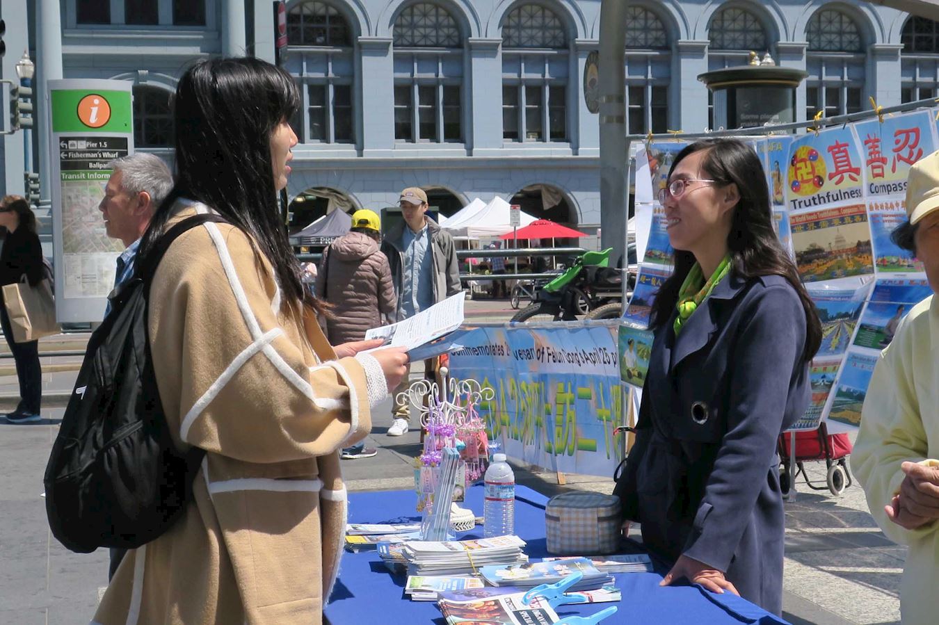 ![]() 图7:路人(左)在了解法轮功真相 |