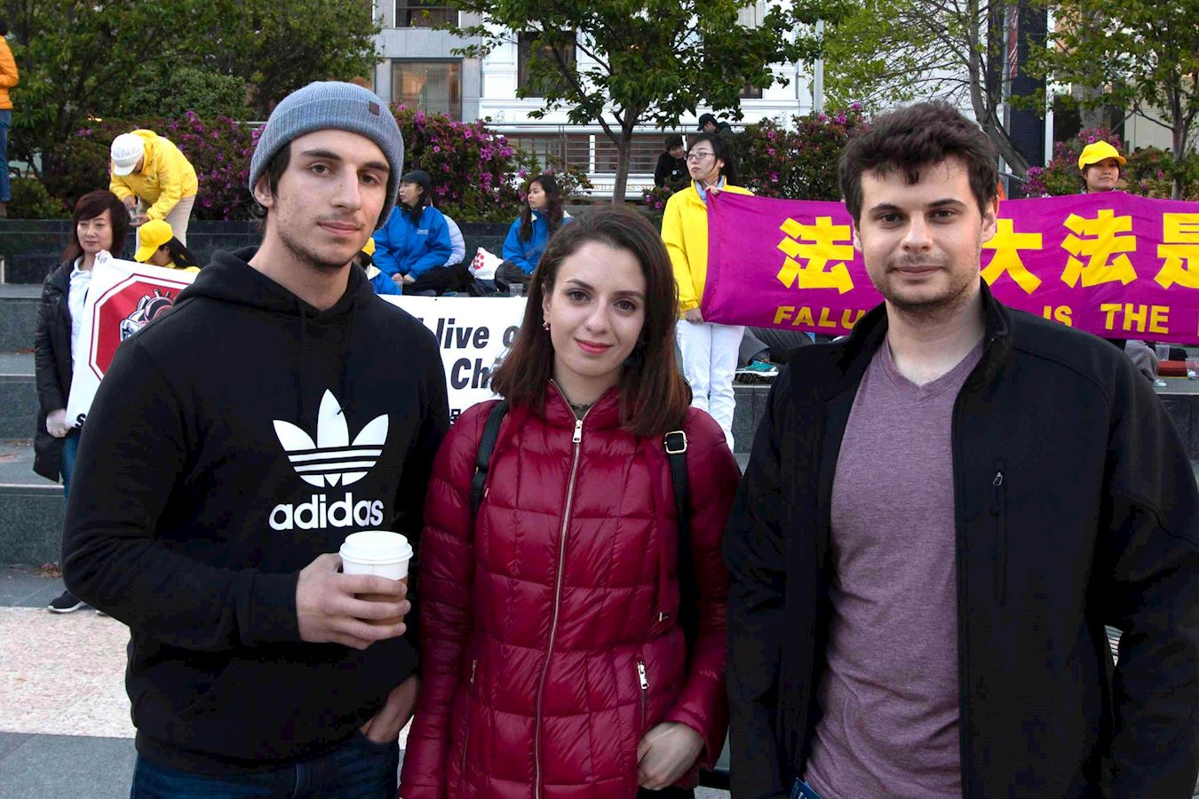 ![]() 图26:旧金山州立大学学生卡里姆(左)、达纳和达吉斯(右)谴责中共活摘器官 |