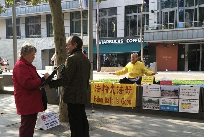 通过贝特曼的讲解,人们获知真相,大多数市民和游客都欣然签名支持法轮功学员的反迫害。