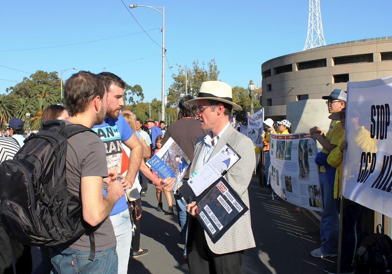 图4:墨尔本法轮功学员马克·贝特曼(Marc Bateman)在市中心城市广场向过往民众展示自制的中英文展板。