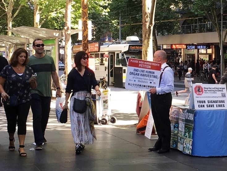 图1:墨尔本法轮功学员马克·贝特曼(Marc Bateman)在市中心城市广场征集民众的支持签名。