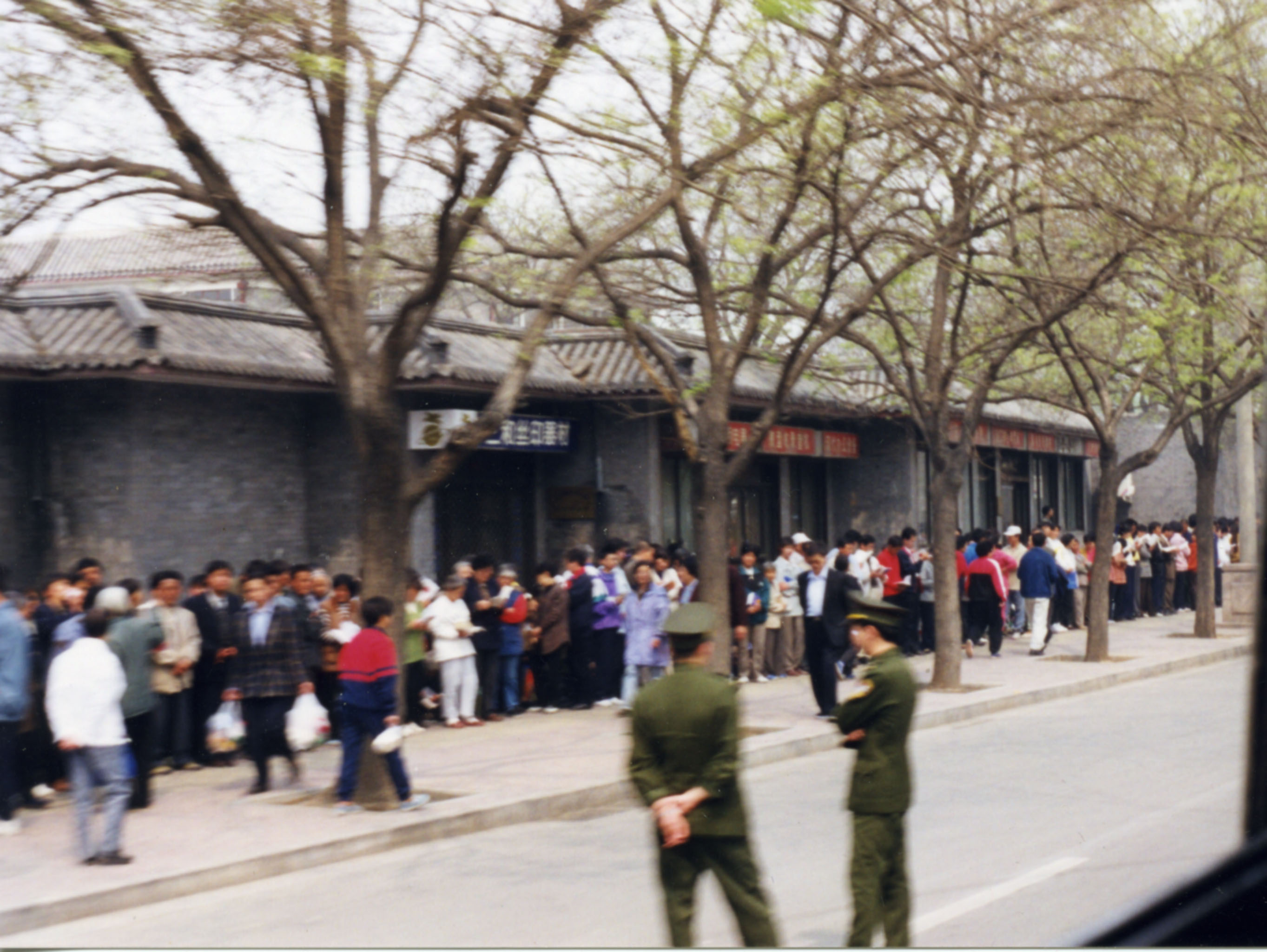 1999年4月25日逾万名法轮功学员在北京和平上方,图为站在北京府右街西侧便道上的上访的法轮功学员。