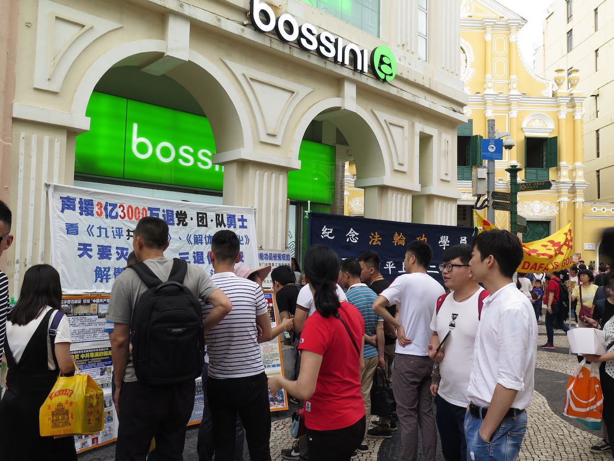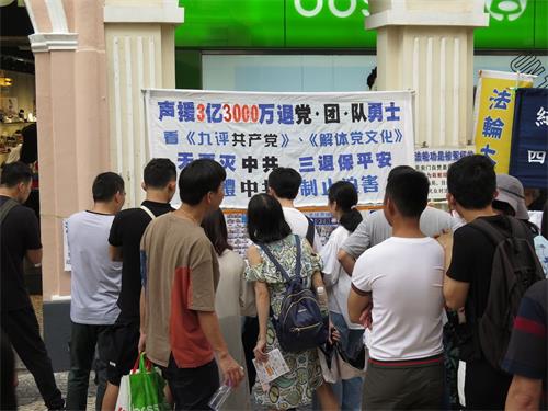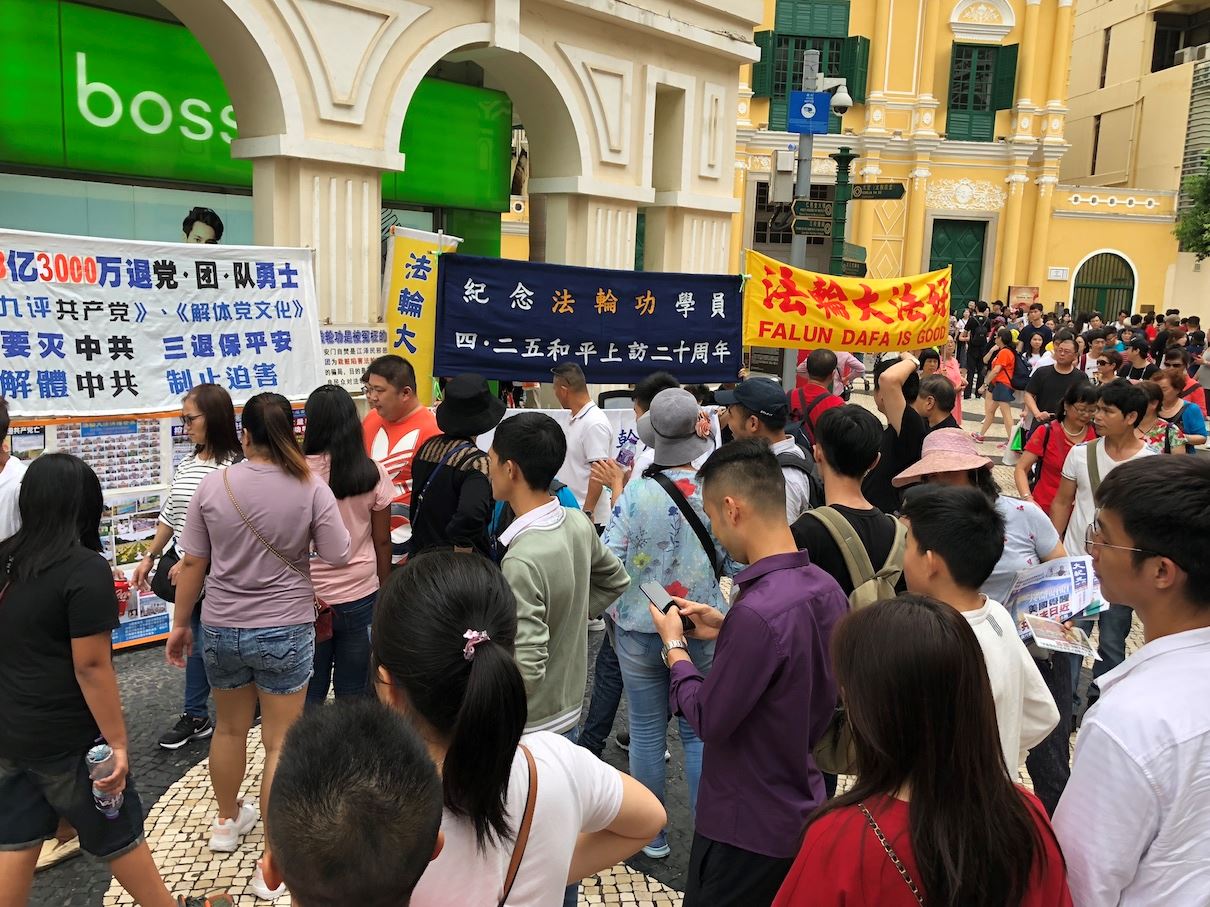 四月份开始,澳门连续下雨,前一天更是狂风暴雨,等到集会当天,风也停了,雨也停了,游客和居民都在玫瑰堂步行街游览购物。当澳门法轮功学员打开“纪念法轮功学员四·二五和平上访二十周年”、“法办江泽民 罗干 周永康 刘京 曾庆红 薄熙来”、“法轮大法好”的大幅横幅时,大批的游客及居民聚集过来,围成一圈又一圈,争先恐后地观看横幅和揭露中共恶行及讲述法轮大法美好的图片。