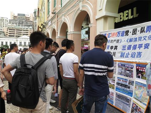 集会上,有三位大陆游客,认真地观看图片及横幅,很长时间都不愿离开,澳门学员就去和他们讲大法真相,并询问他们是否知道三:退.保平安?