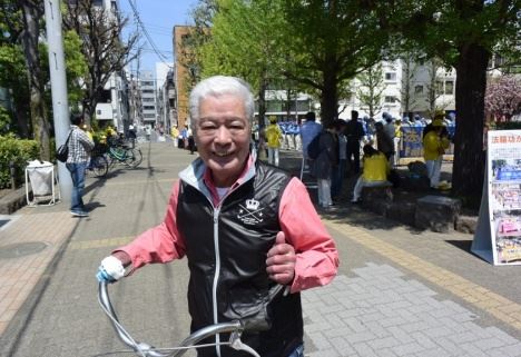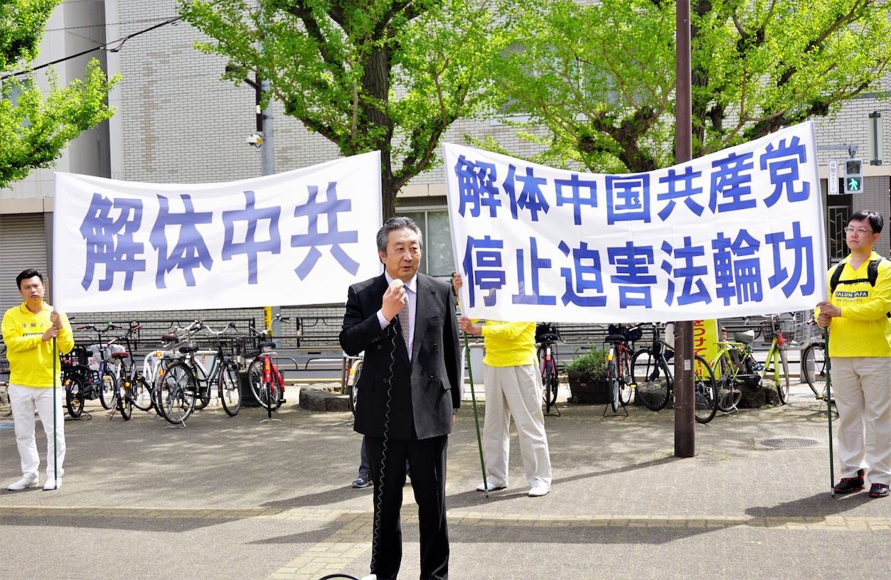 最后法轮大法学会会长稻垣兼太郎先生致词,他说,当初法轮大法在中国传出时,中国还是发展中国家,对有可能造成高额医疗费用的民众的健康状况的改善,做出了很大贡献,所以修炼人数很快达到了上亿人。当时的共产党员人数是7千万,当修炼法轮功的人数超过共产党员人数的时候,引起了当时的国家主席江泽民的妒嫉,一九九九年一意孤行开始镇压法轮大法。为了给镇压找借口和政党的理由,中国政府进行了铺天盖地的诽谤宣传。到现在对法轮功的镇压和对法轮功学员器官的活摘的罪恶还再继续。大量证据曝光了中国政府活体摘取法轮功学员器官的恶行,日本的大部份民众并不知道这个事实。我们希望通过这样的活动让更多的日本民众了解这个情况,加入支持我们反迫害的行列。