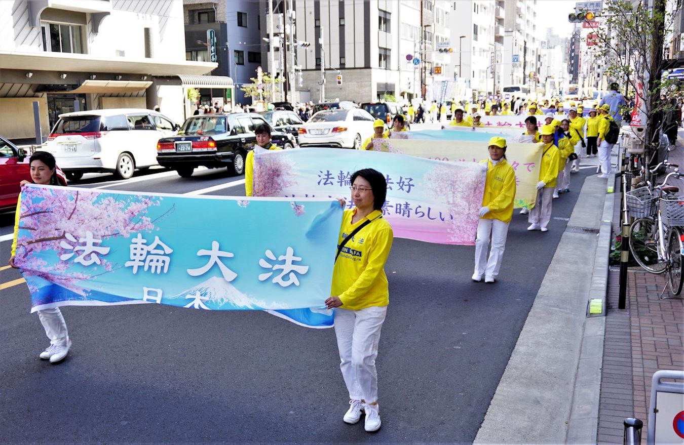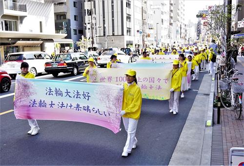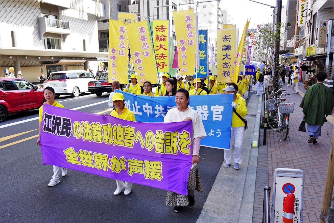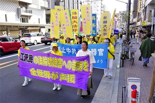 游行从下午两点从集会地点的花川户公园出发,绕景点的大道一周又回到出发点,大约一个半小时。队伍由警车开路,随后是近百人的天国乐团先行,接着是手持各种真相横幅队伍缓缓前行,部份法轮功学员沿途发放真相资料,征求告发江泽民迫害法轮功的签名。