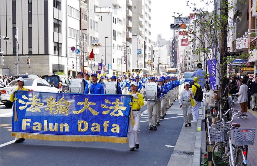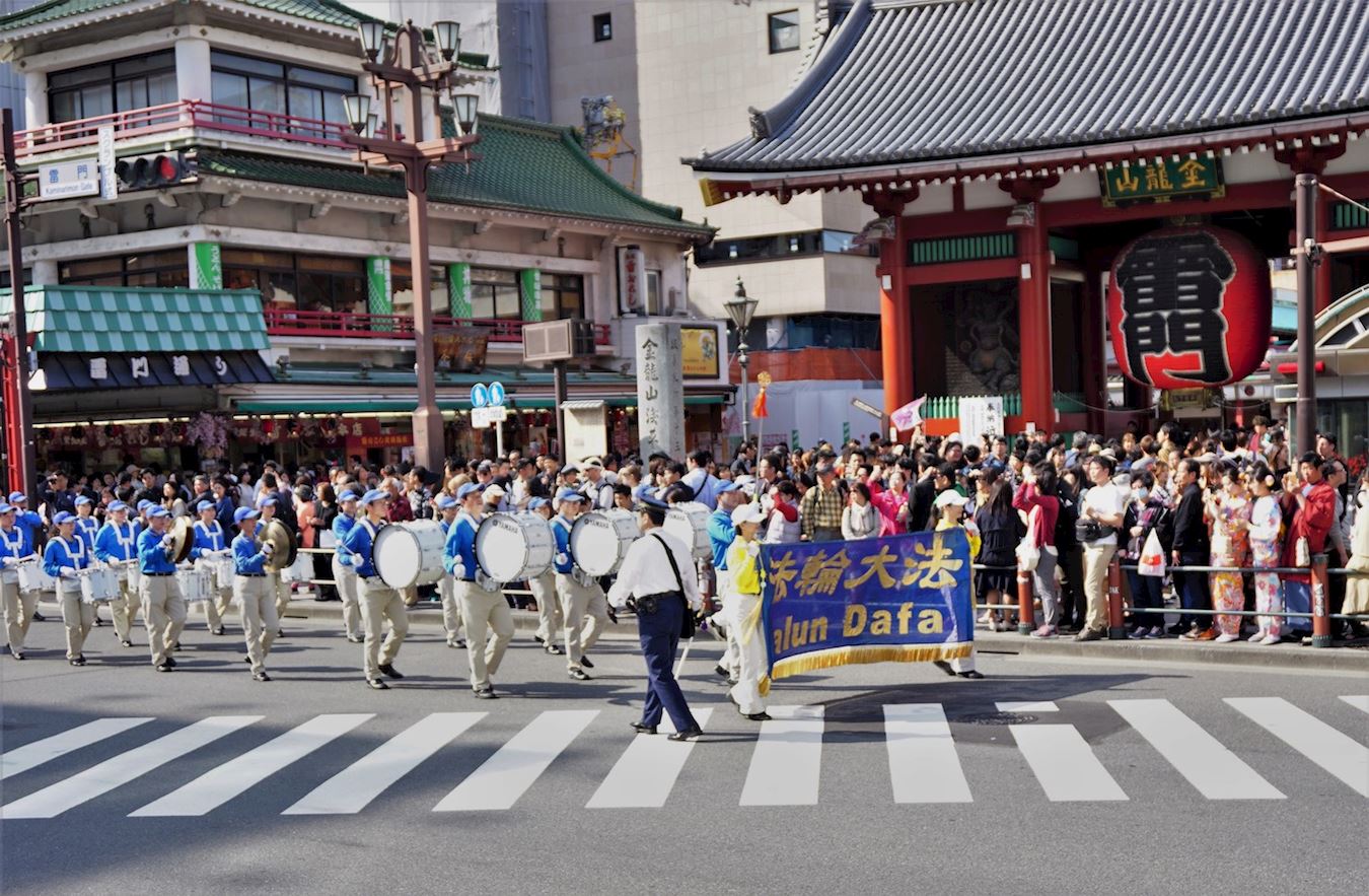 穿着统一服装,队伍整齐的法轮大法天国乐团的队员演奏《法轮大法好》、《法正乾坤》、《法轮圣王》、《欢乐颂》等九首曲目,鼓声阵阵,嘹亮而振奋人心的乐曲,引来行人和游客驻足观看。有的招手致意,有的伸出大拇指表示赞赏。众多日本民众和游客观看横幅,纷纷拍照留念。