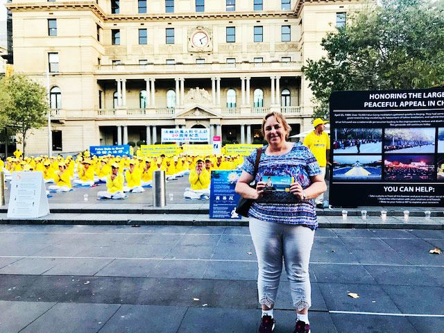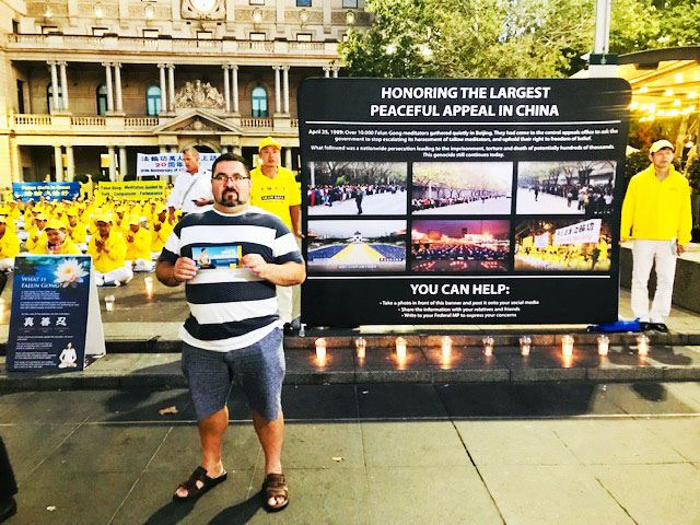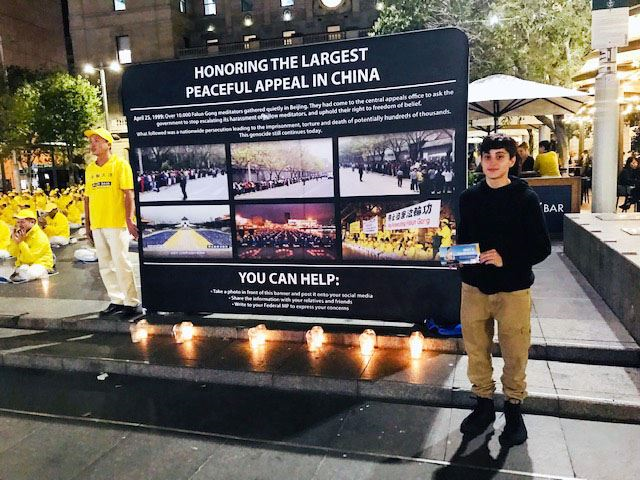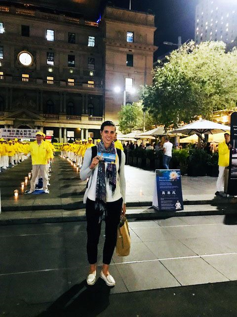 来自阿德莱德的朱莉(Julie)女士来悉尼探望自己的孩子,了解真相后,她说:“我自己深感愧疚之前一直没有听说过法轮功。我认为每个人都有权利选择自己的信仰从而做有利于社会的人。我觉得中国政府肆意杀害在中国的法轮功修炼者是大错特错的行为。我表示赞同今晚这种和平请愿的方式向世人诉说法轮功的处境,因为作恶的政府最害怕的就是把他们的罪行被社会曝光。我认为法轮大法的真、善、忍是无可争议的普世价值。中国政府对法轮功的迫害和‘六·四’在天安门用坦克血腥镇压请愿学生如出一辙,迫害者是因为恐惧而加害于受害者。”