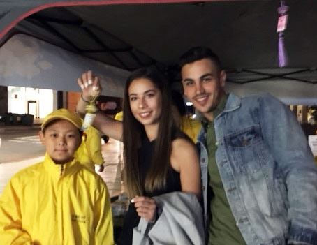 年轻人杰慈(Jaz Demetri)和亚历克斯(Alex Somentino)在支持法轮功反迫害的签名本上签字后表示:“我们认为你们今天用静坐方式讲真相非常美好,并且我们认为每个人都有权力去争取和平!你们今天每个人都在为中国法轮功学员争取和平和信仰自由而努力,我们也非常高兴支持你们每个人正在做的。”