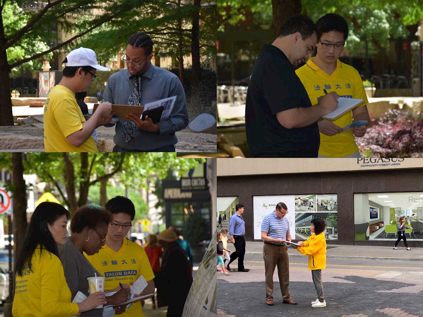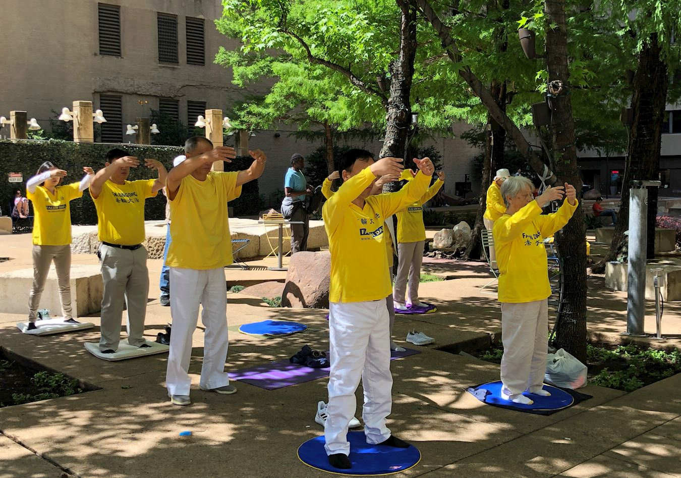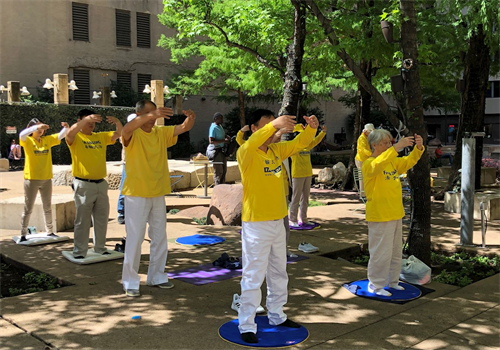 ![]() 图1~2:二零一九年四月二十五日中午,达拉斯法轮功学员在市中心的飞马公园(Pegasus plaza)集体炼功、向过往的行人介绍法轮大法,曝光中共对法轮功的迫害,纪念四·二五和平上访二十周年。 |