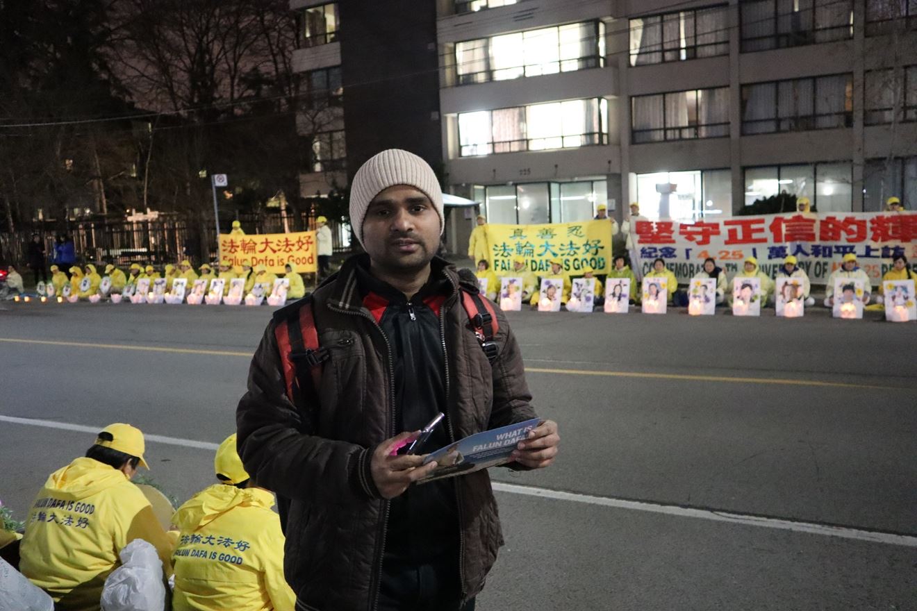 来自印度的常德列席(Chandresh)先生经过现场,停下来询问了很多问题。当他了解到法轮大法的美好和法轮功学员在中国被迫害的真相后,他非常吃惊的说:“我之前经常经过中领馆时,只是知道迫害这件事,今天我知道了这些人(法轮功学员)被迫害的原因。”