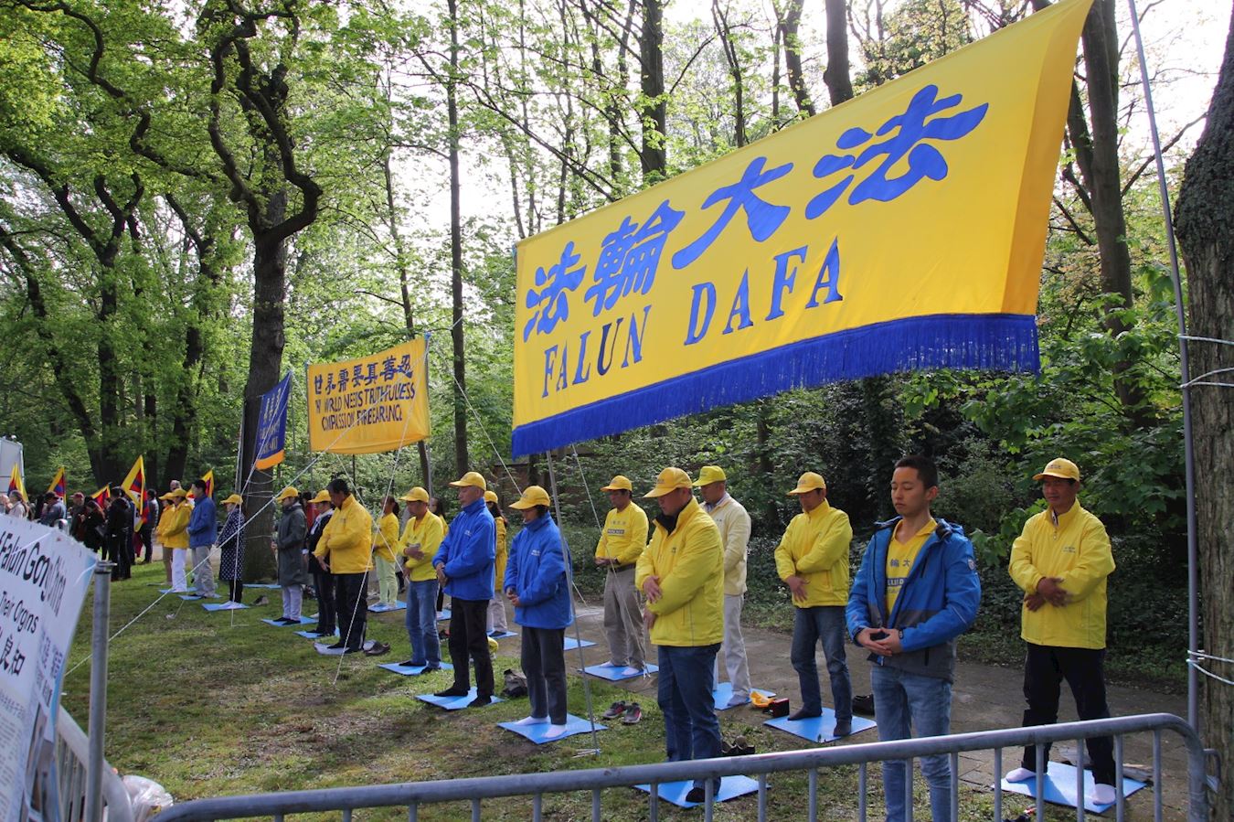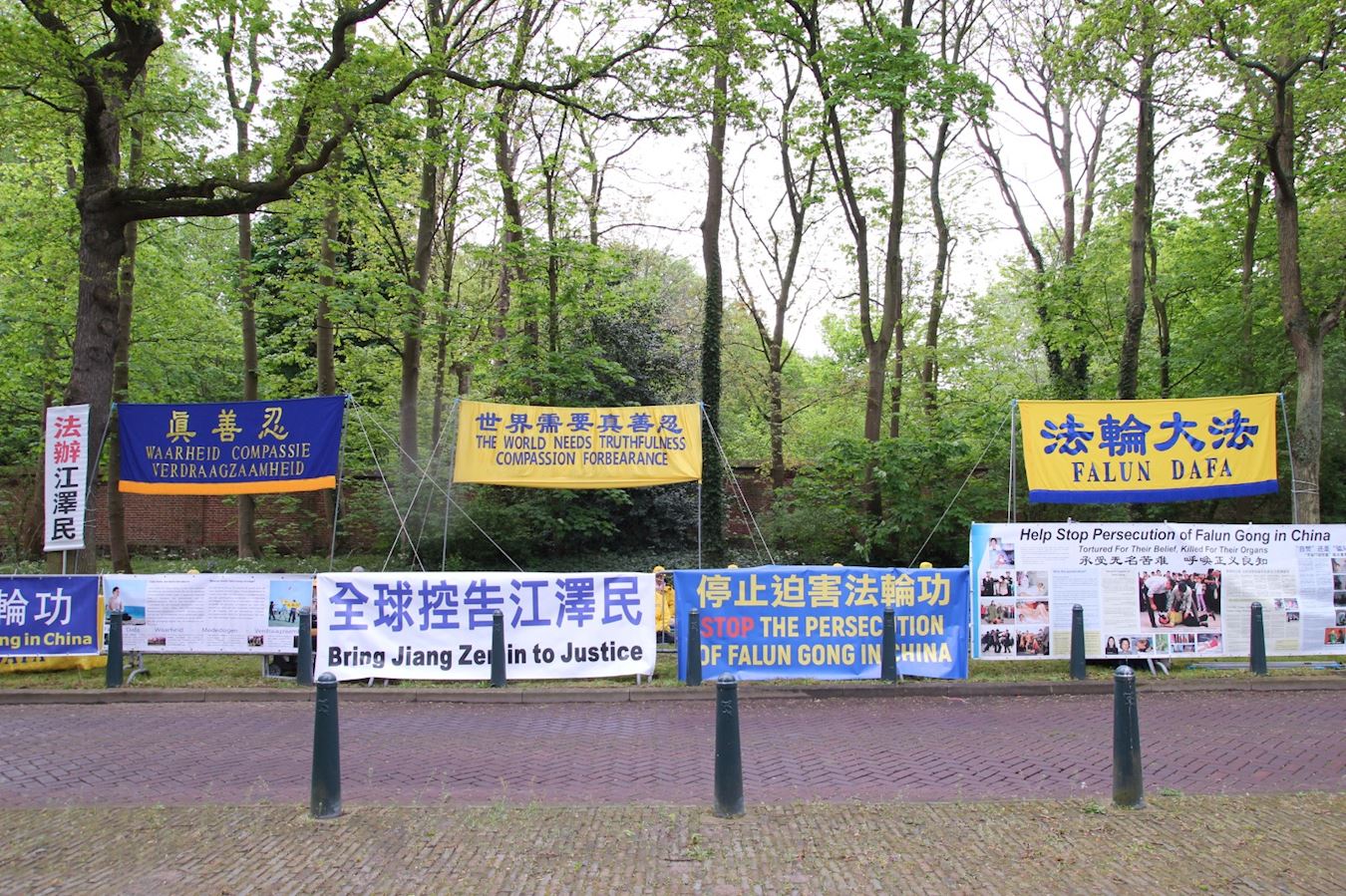 这一天,几十名来自荷兰各地的法轮功学员早早来到中共大使馆门前,正对着大使馆的建筑悬挂几条横幅,上书中英文大字:“法轮大法”、“世界需要真善忍”,“法办江泽民”、“全球控告江泽民”、“停止迫害法轮功”等。还有一幅图文并茂的展板,显示中共邪*党-迫害法轮功的真相,以及警察酷刑大法弟子的真相,活体摘取法轮功学员器官的真相。