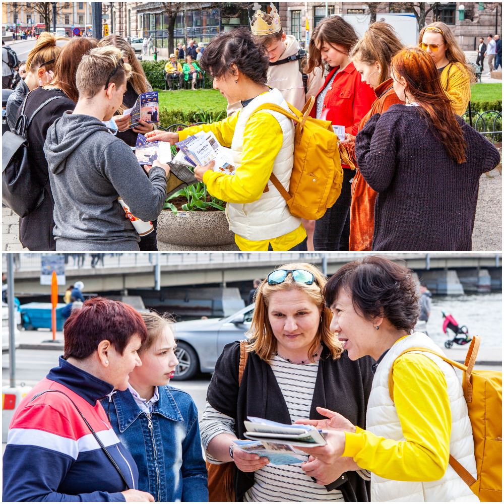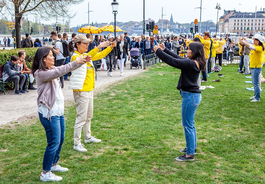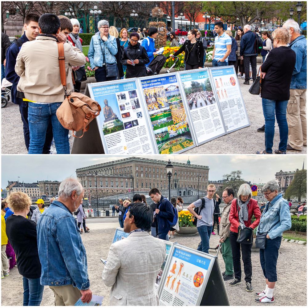 两位西人学员温纳(Werner)、索菲亚(Sofia)通过扬声器,用瑞典语、英语向当地民众及来自世界各地的游客介绍什么是法轮功以及二十年前的四月二十五日,发生在北京的和平理性万人上访的事实真相。法轮功悠扬悦耳的炼功音乐,缓、慢、圆的炼功动作吸引了很多游人驻足观看,人们都不由自主地拿出手机录像,有的用炼功场面做背景拍照留影,有的当场就走进炼功场地,认真的学起了炼功动作来。